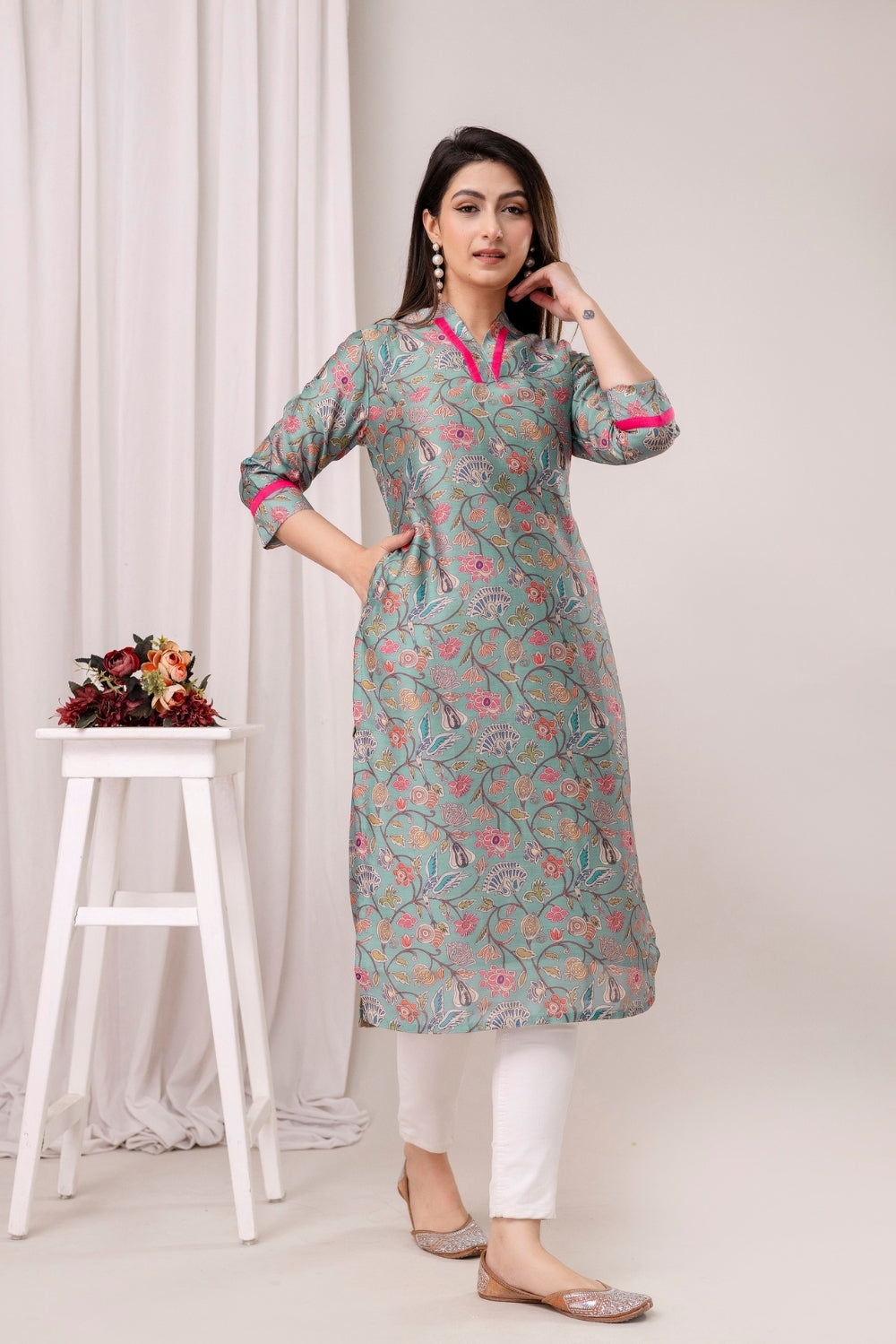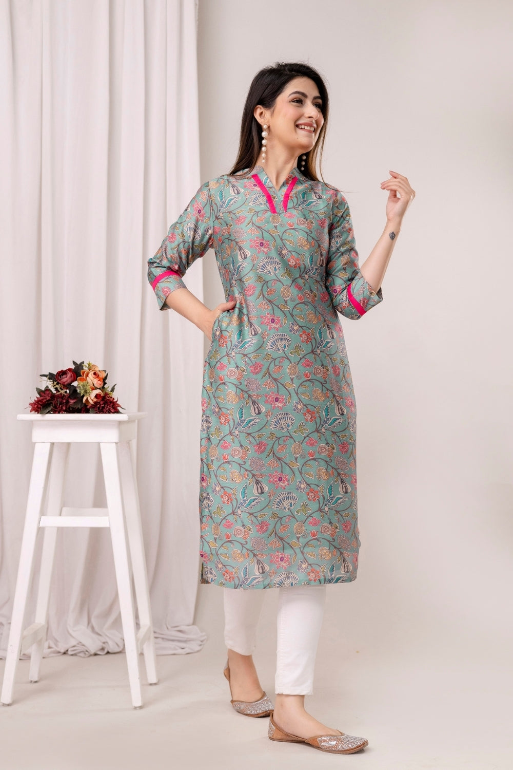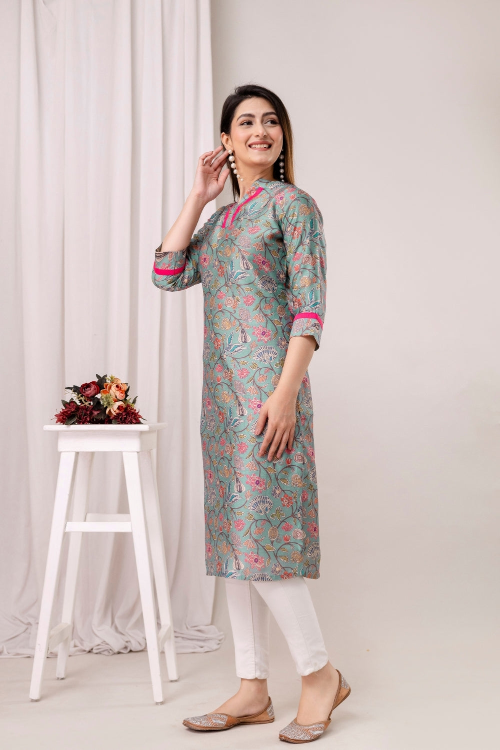 Elevate your everyday elegance with this charming Chanderi kurta, featuring a delicate floral buta print in soothing pastel tones.