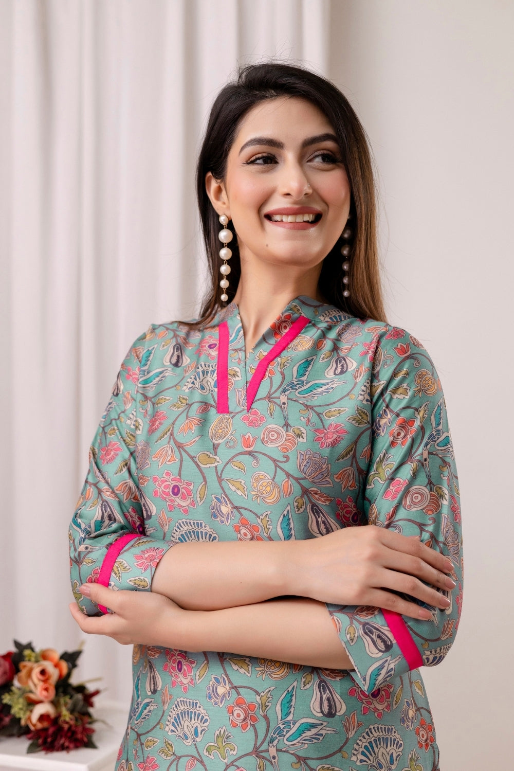 The sleek V-neckline with contrast piping adds a pop of vibrance, while the three-quarter sleeves and straight silhouette offer all-day comfort.