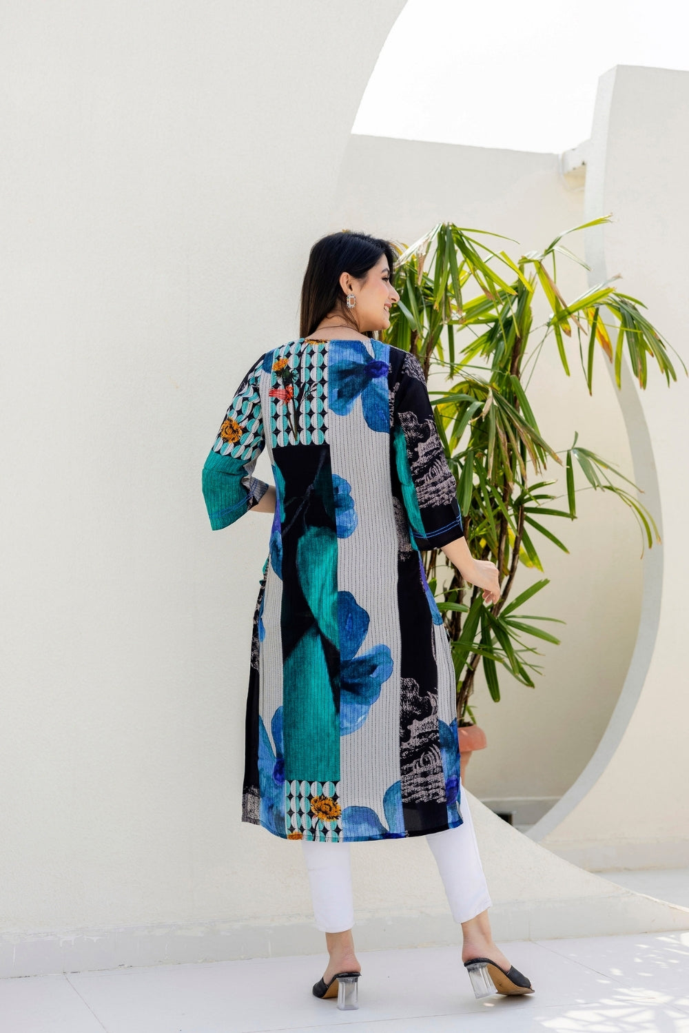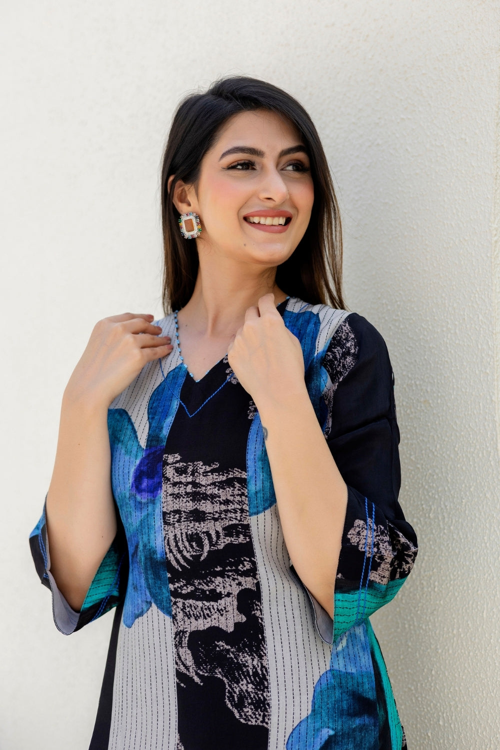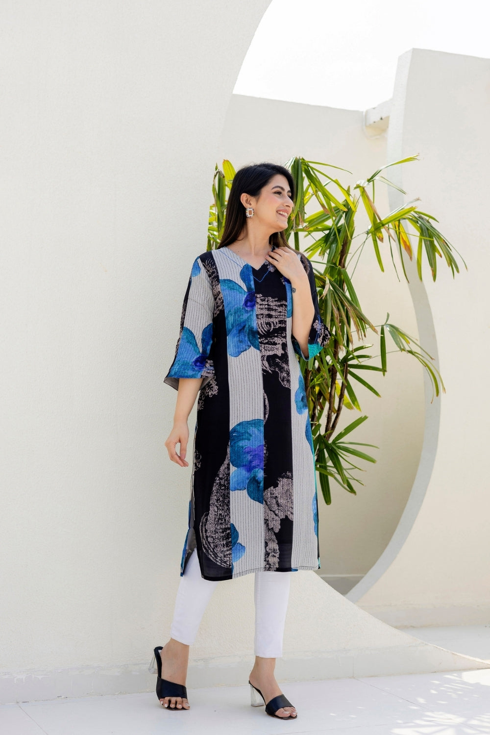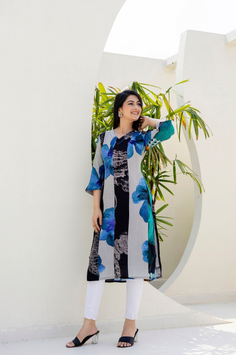 A perfect harmony of bold florals and monochrome textures, this chic crepe kurta features striking blue flower motifs against a classic black and grey striped base.