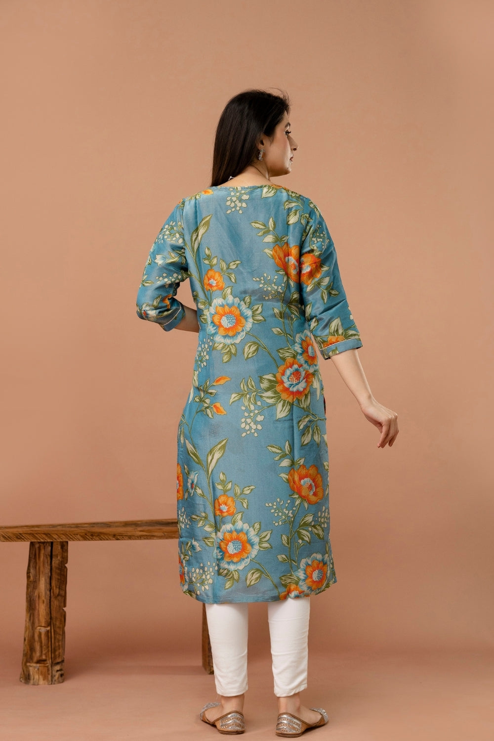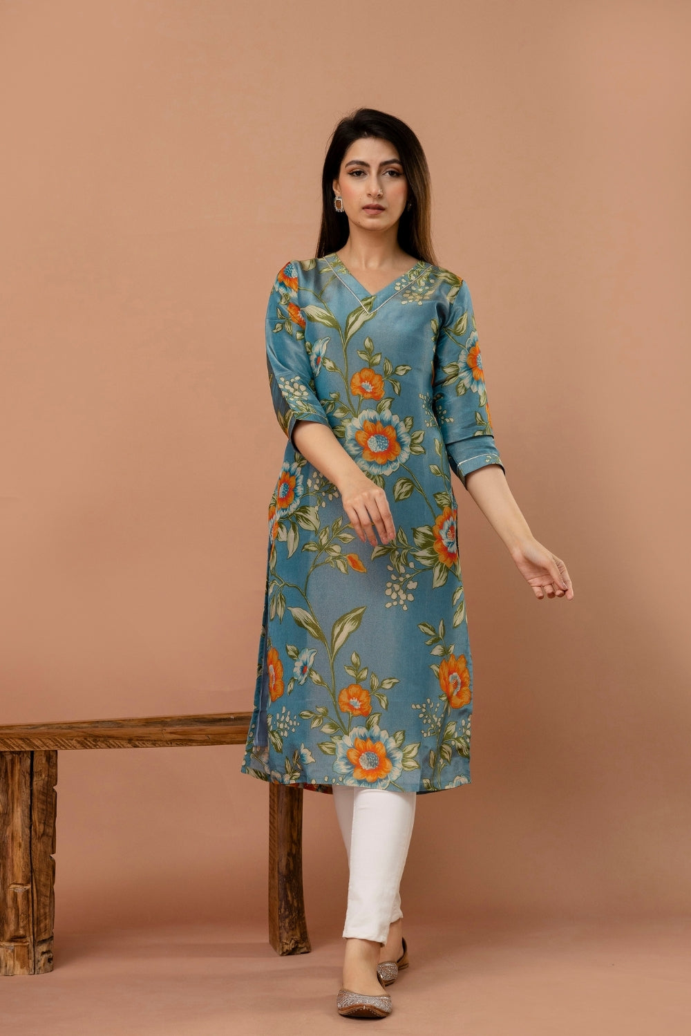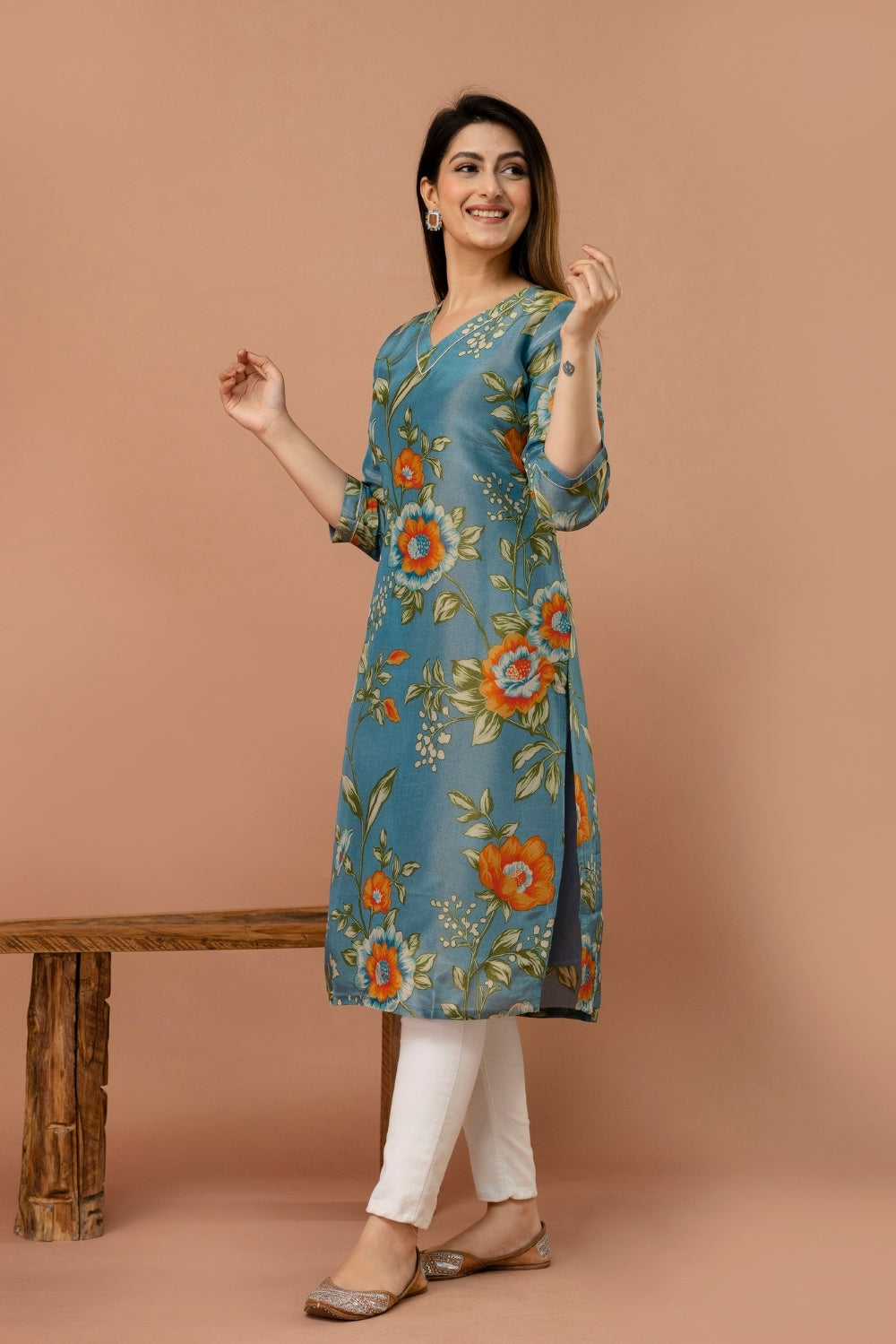Elegant and effortlessly charming, this shimmer tissue kurta in a muted teal blue shade is adorned with delicate floral prints in vibrant orange and soft green.