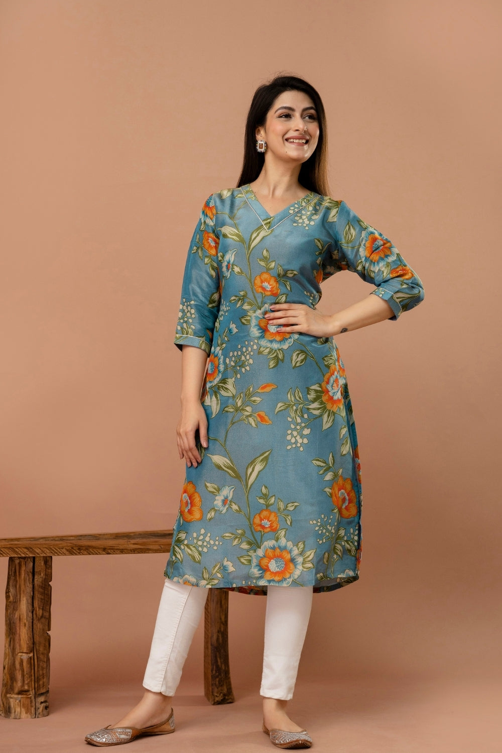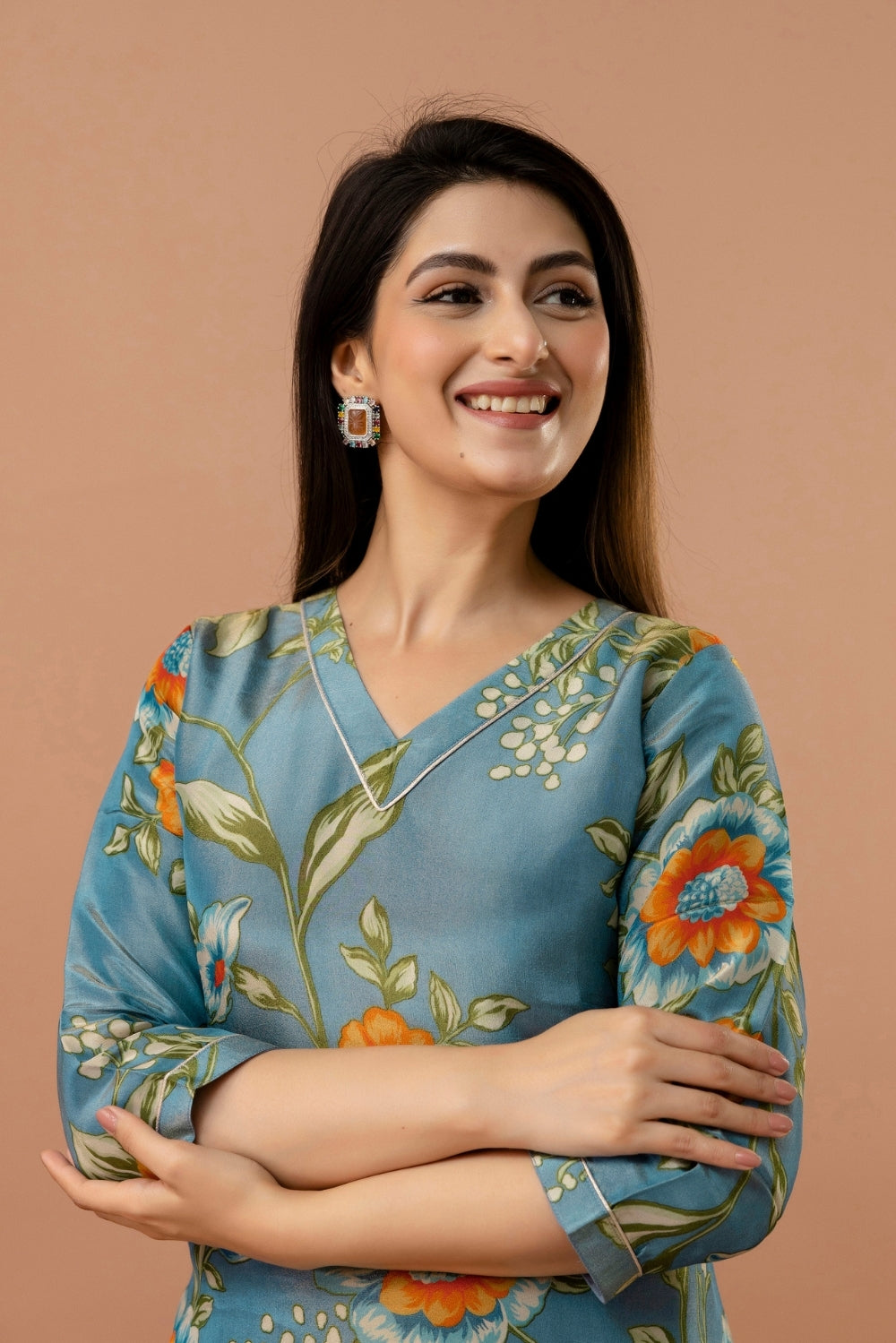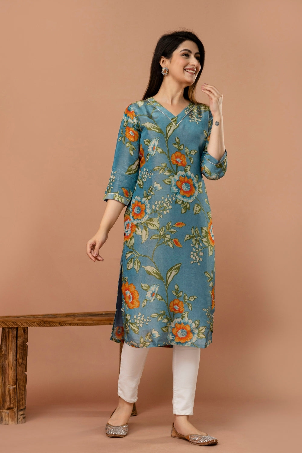 Elegant and effortlessly charming, this shimmer tissue kurta in a muted teal blue shade is adorned with delicate floral prints in vibrant orange and soft green.