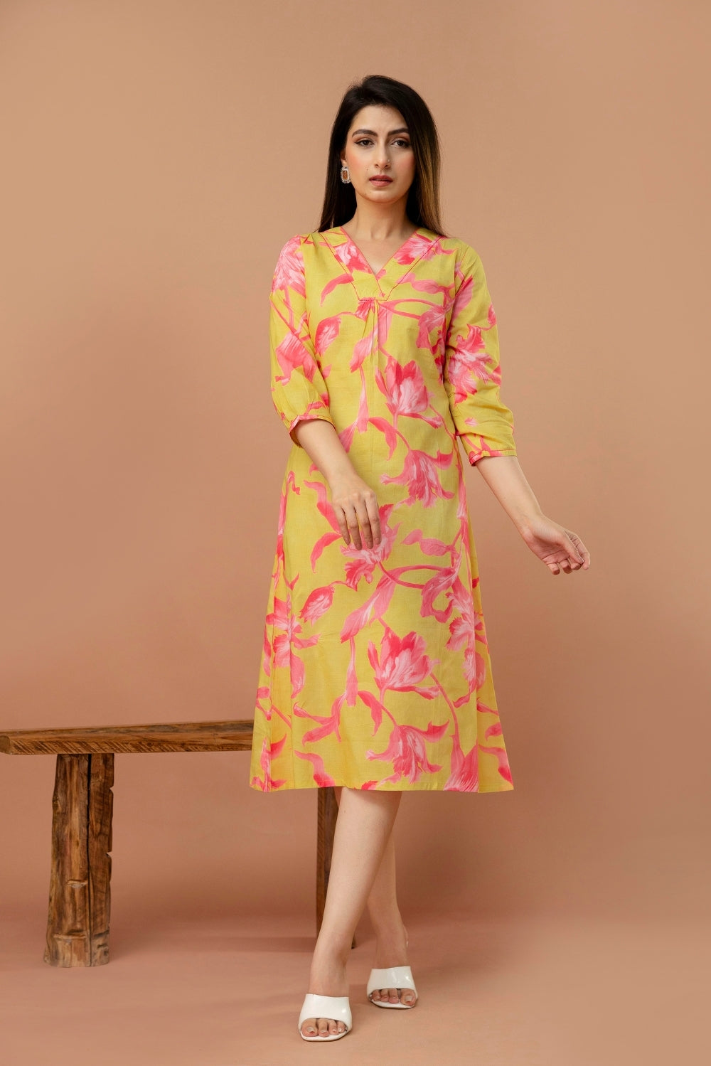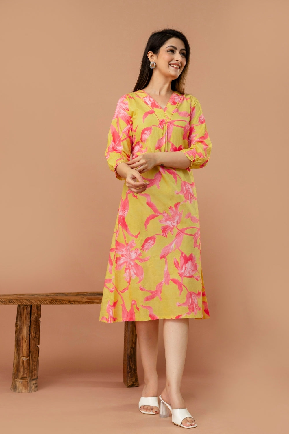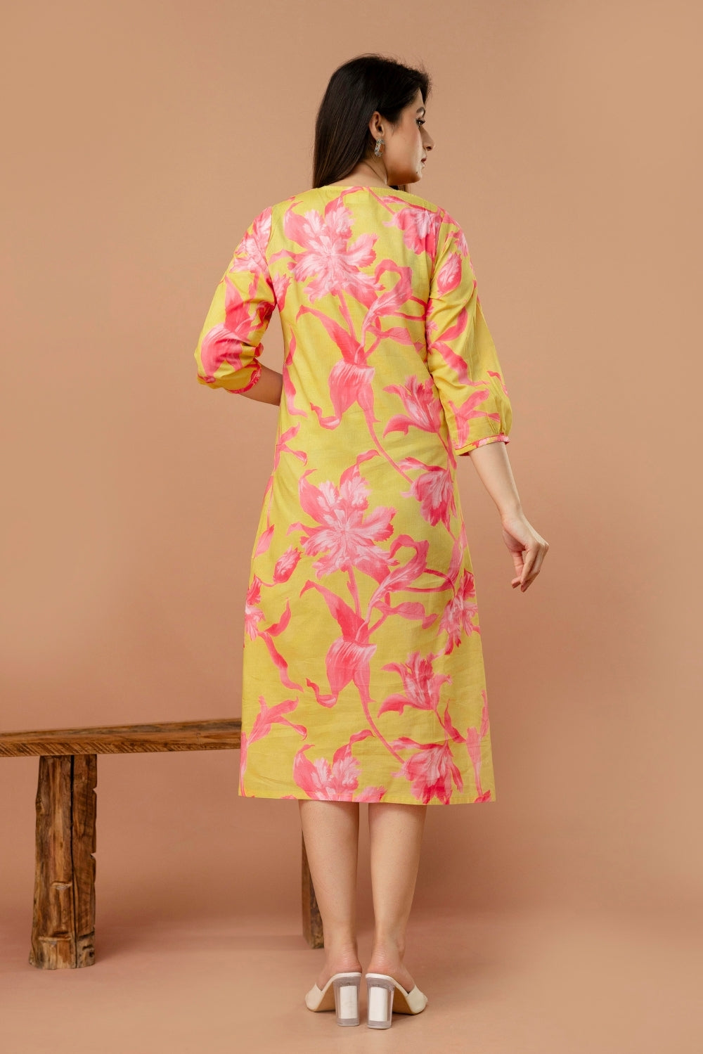 This soft cotton dress in a refreshing yellow hue, adorned with bold pink floral prints, is perfect for those sunny, easy-breezy days.