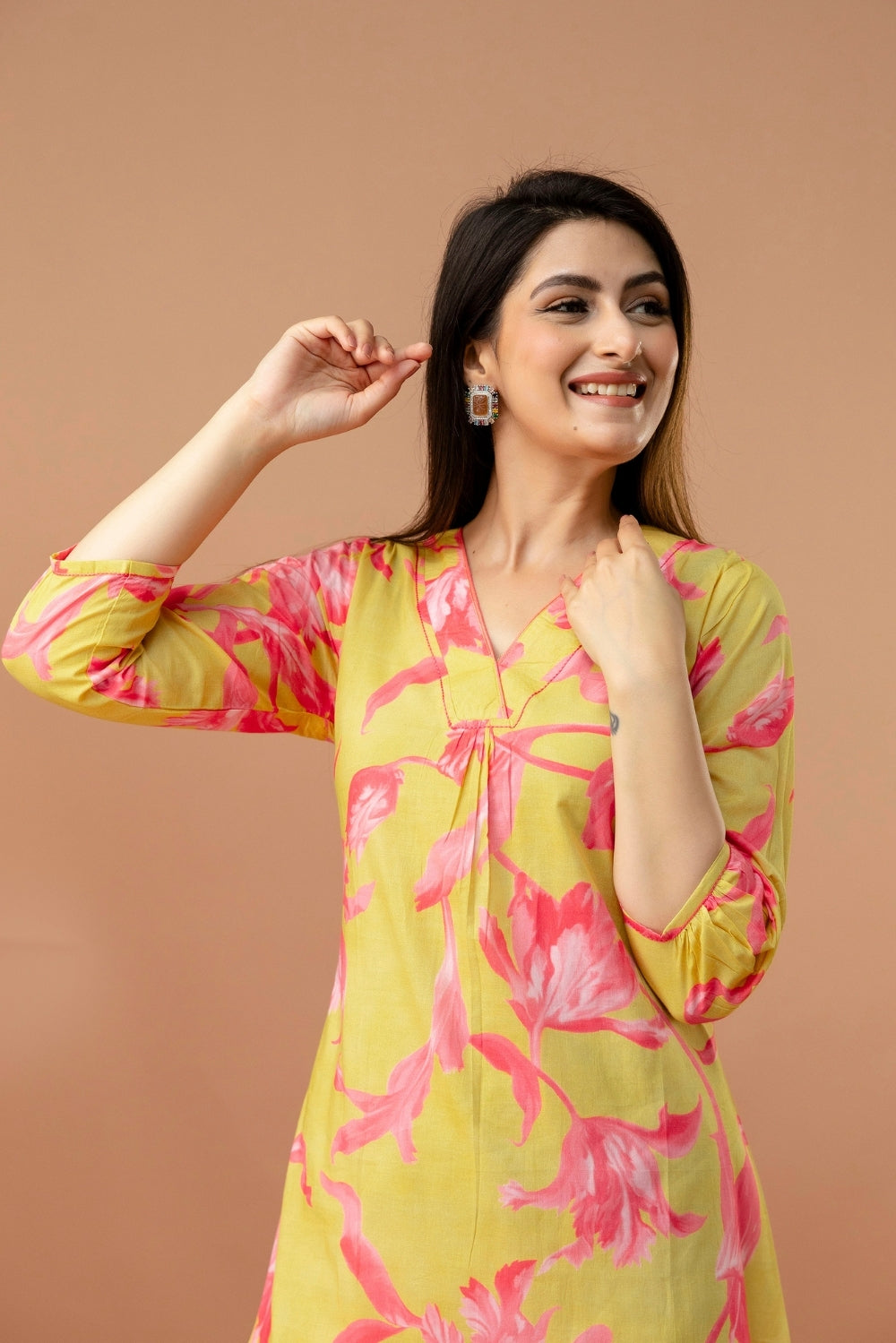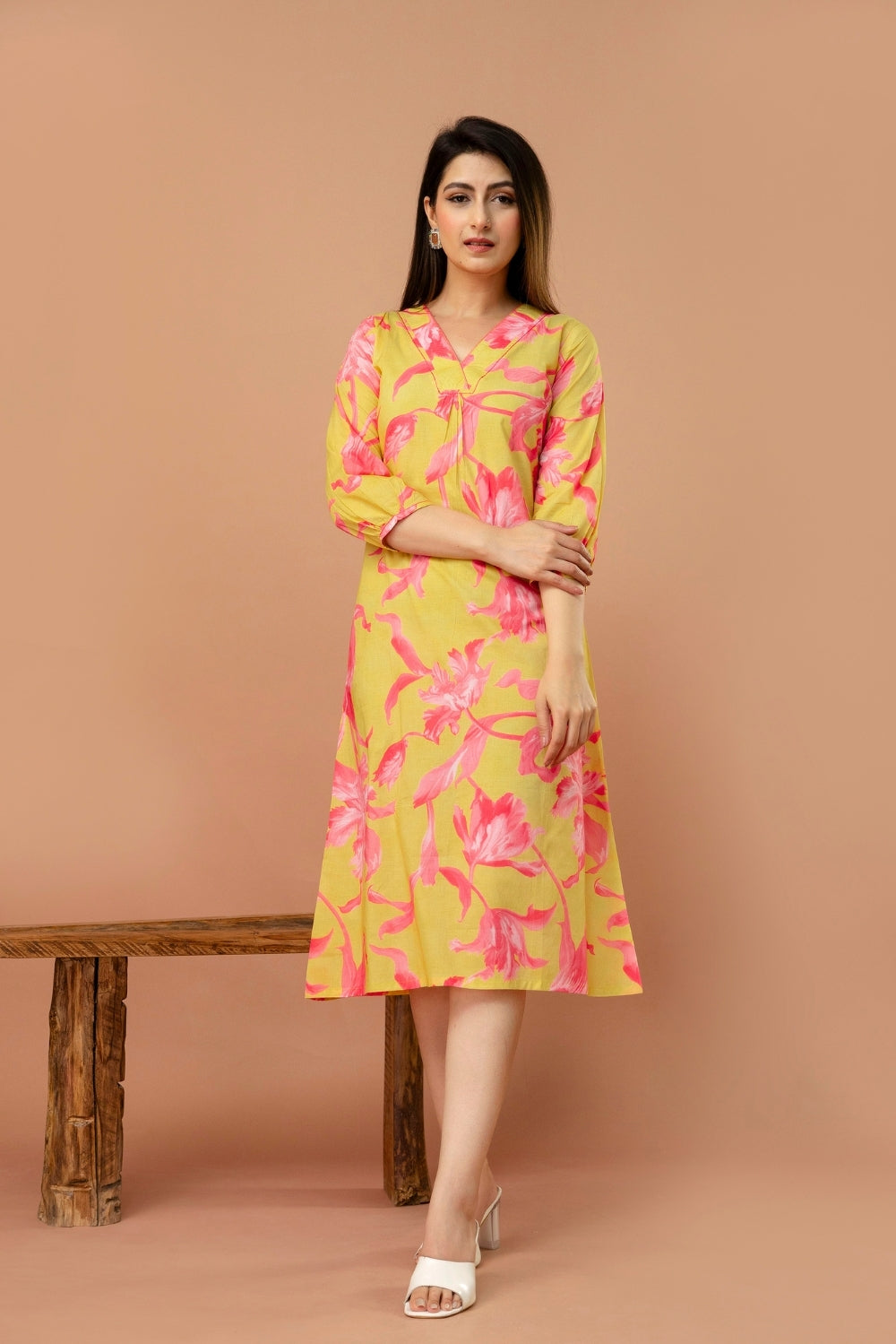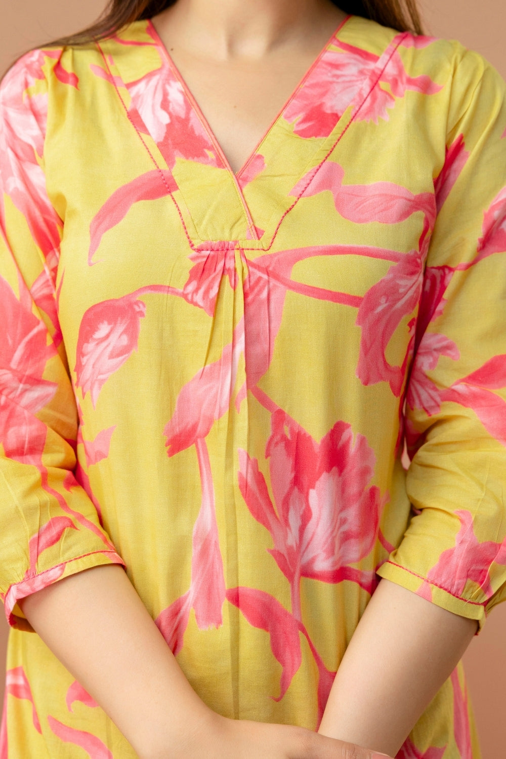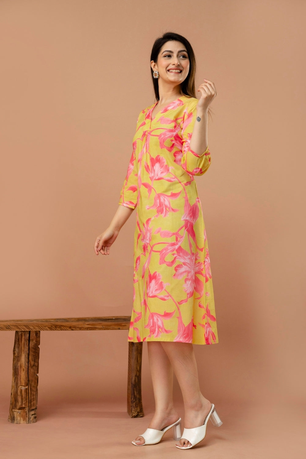 This soft cotton dress in a refreshing yellow hue, adorned with bold pink floral prints, is perfect for those sunny, easy-breezy days.