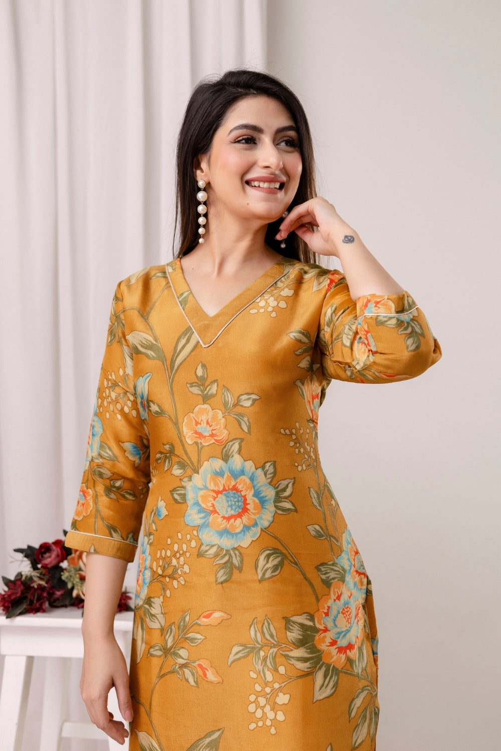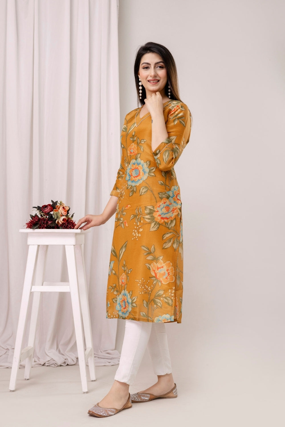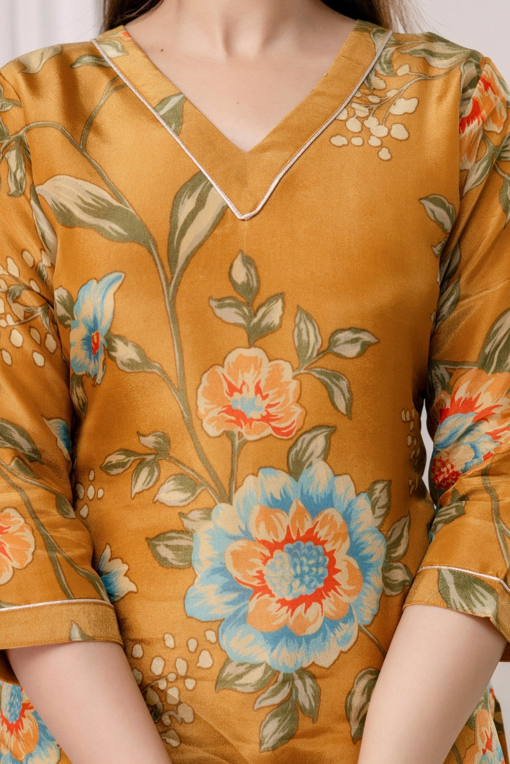 Graceful and radiant, this shimmer tissue kurta exudes understated glamour with its golden mustard base and delicate floral print in soft blues and corals.