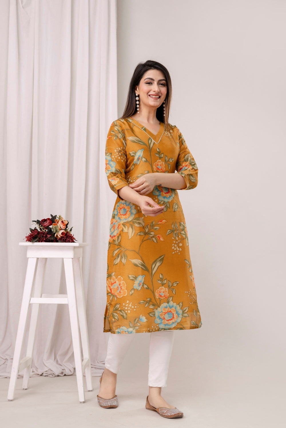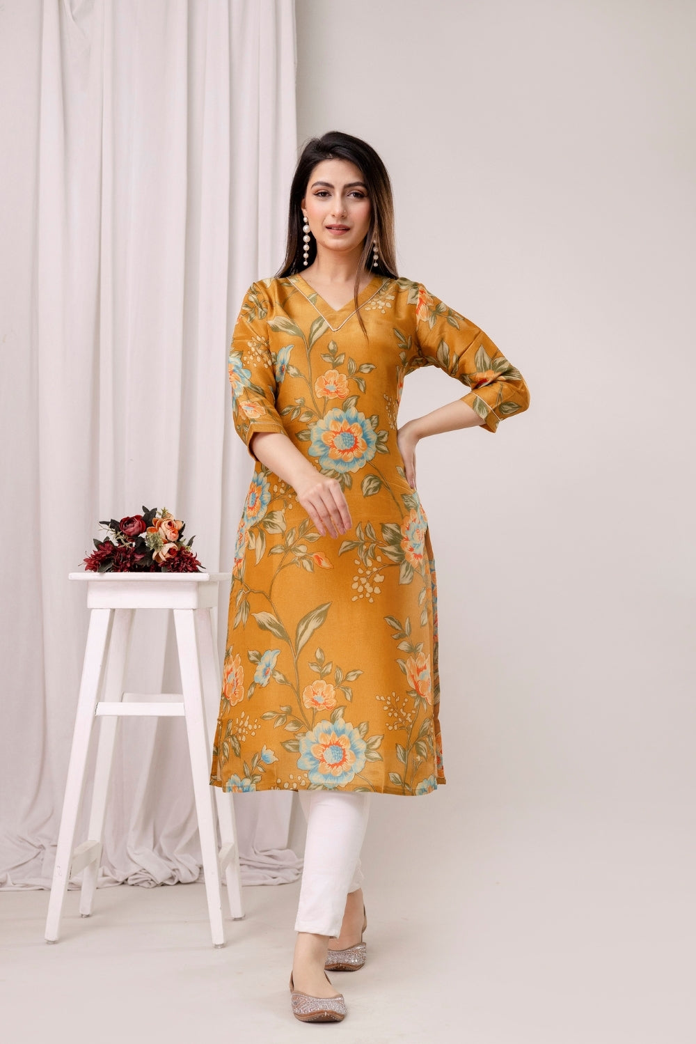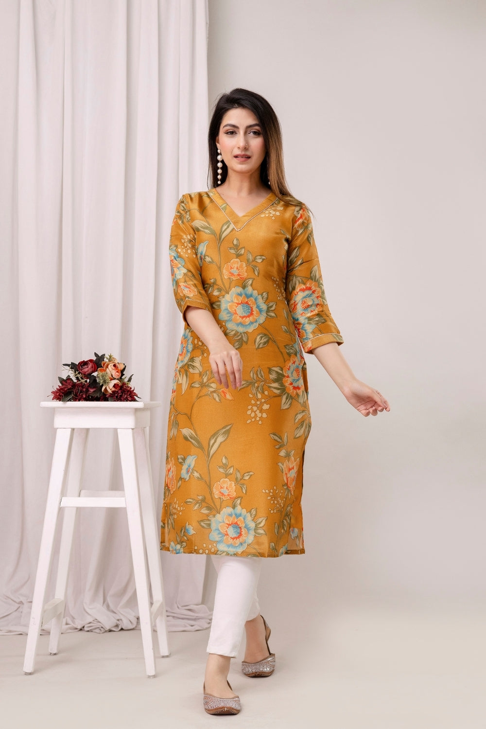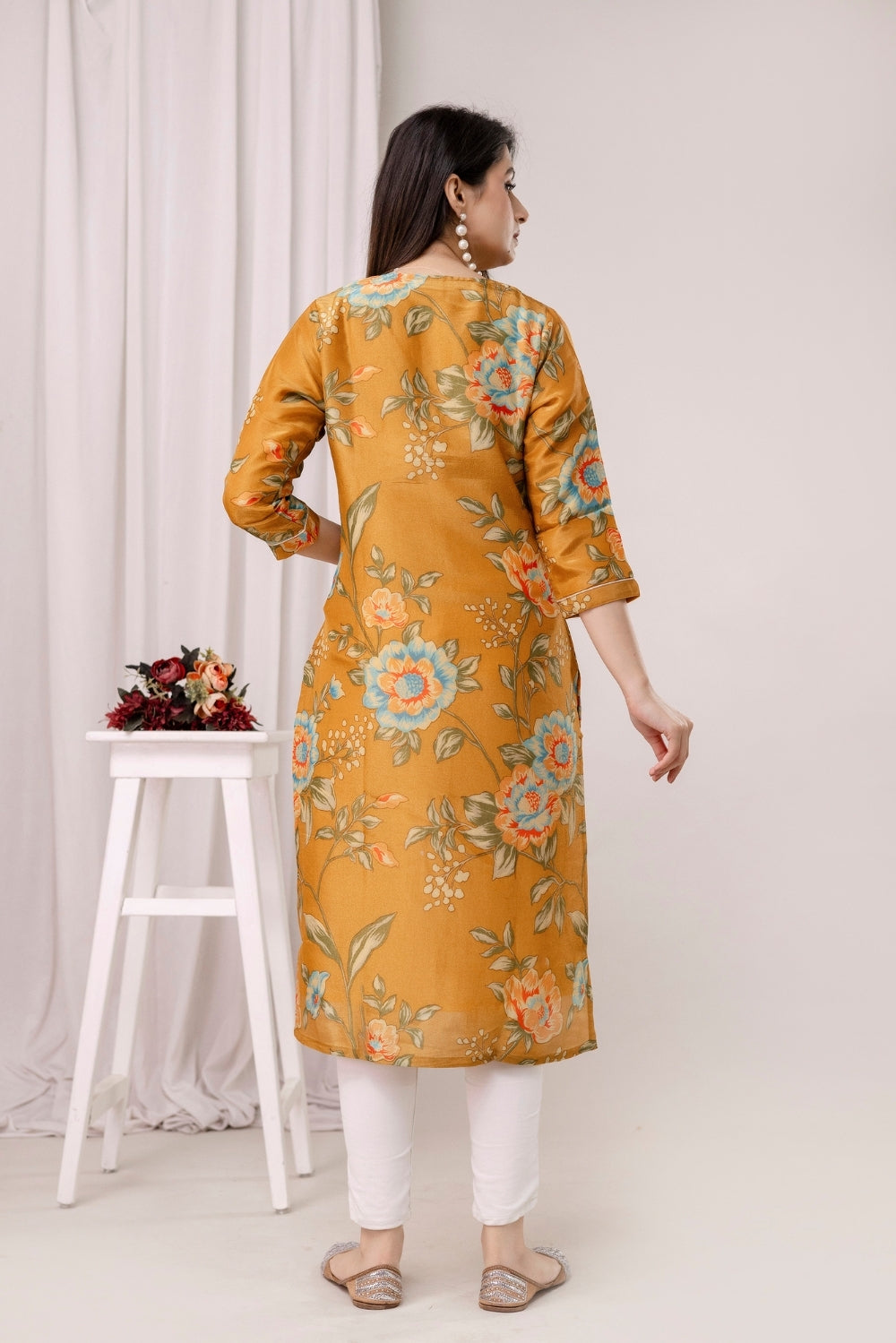 Graceful and radiant, this shimmer tissue kurta exudes understated glamour with its golden mustard base and delicate floral print in soft blues and corals.
