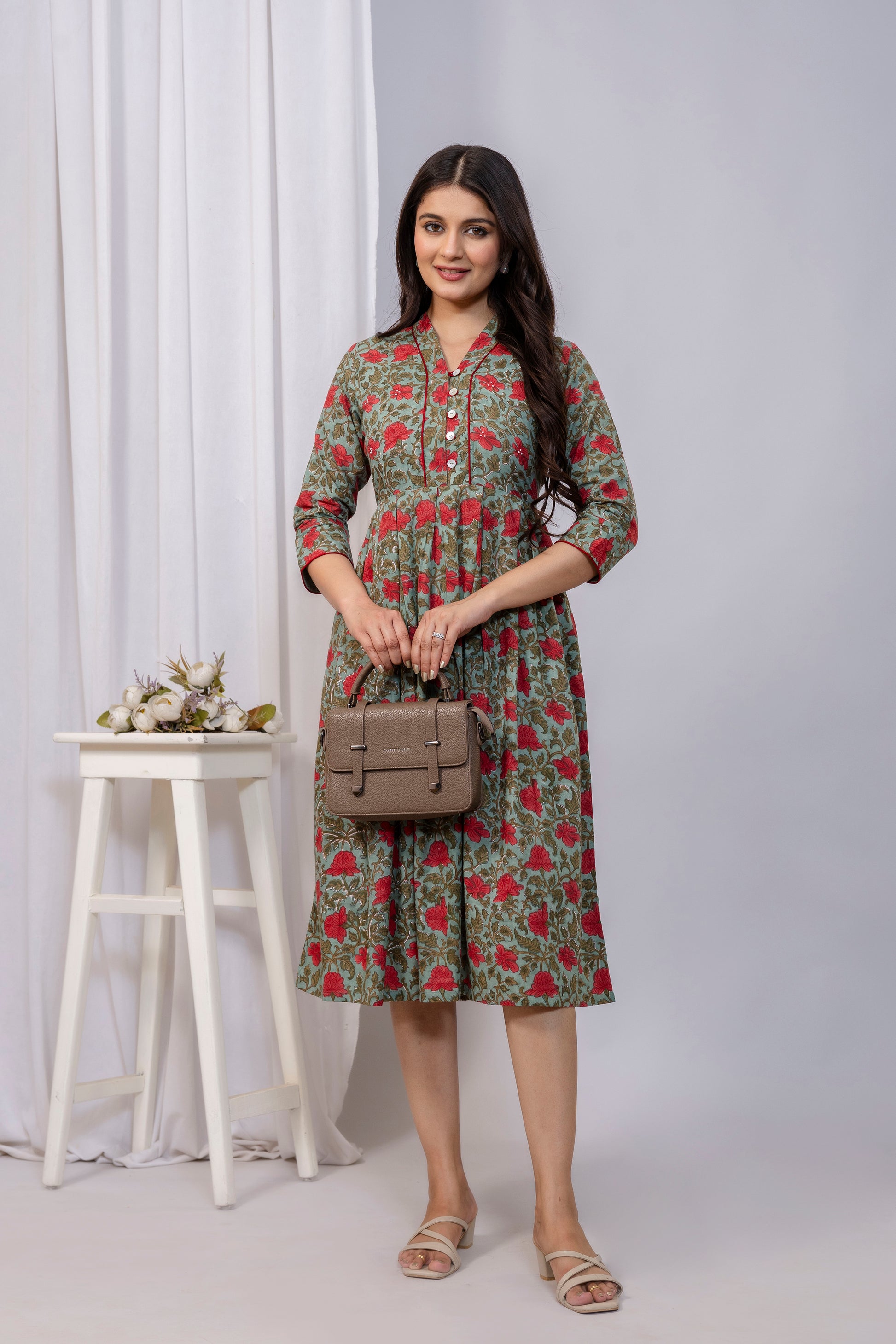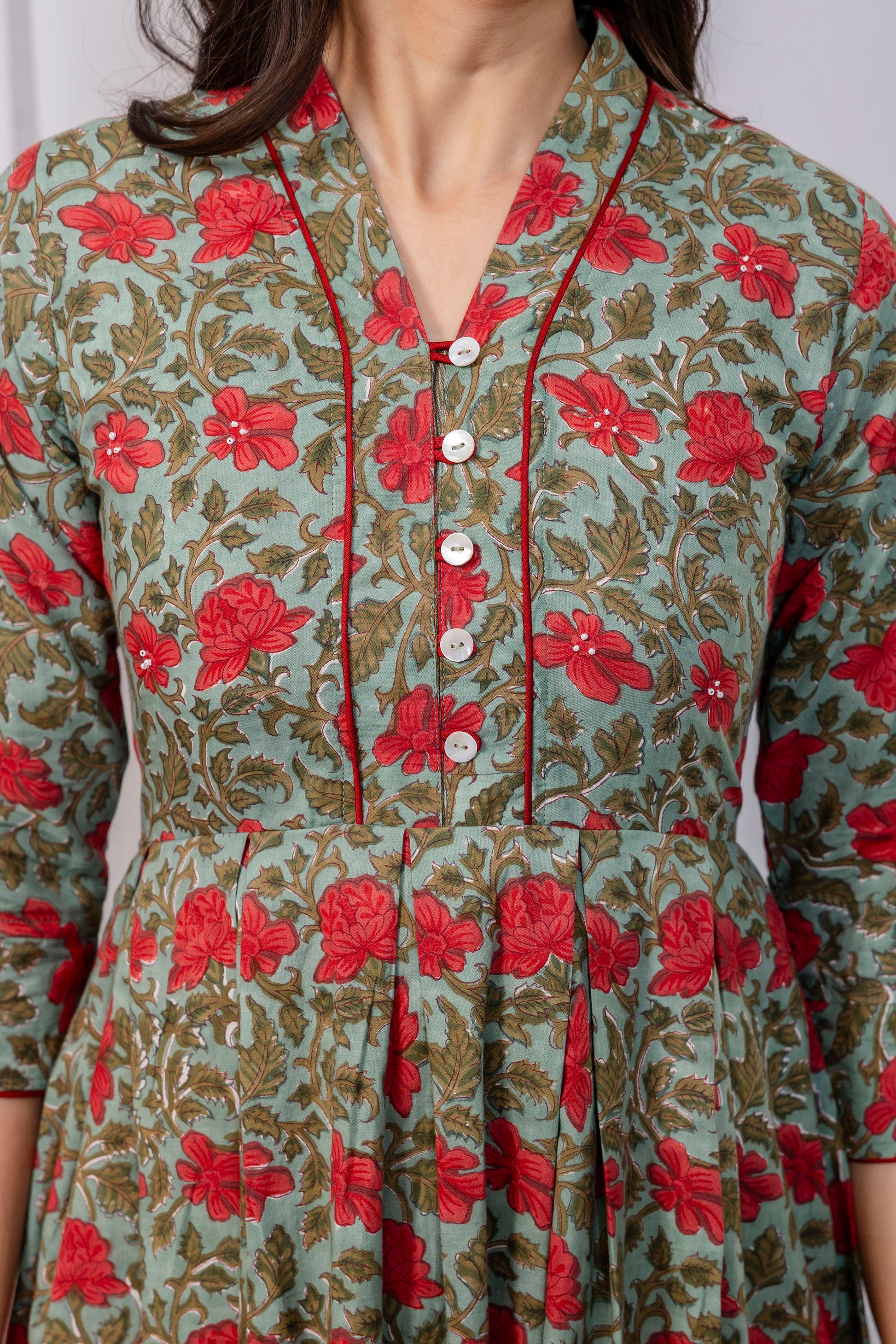 Embrace the beauty of traditional craftsmanship with this stunning hand block printed cotton fabric. Featuring an enchanting dark green base adorned with vibrant red flowers, this piece captures the essence of timeless artistry. Perfect for summer wear, the breathable cotton keeps you cool and comfortable while the intricate floral design adds a touch of elegance to any outfit.