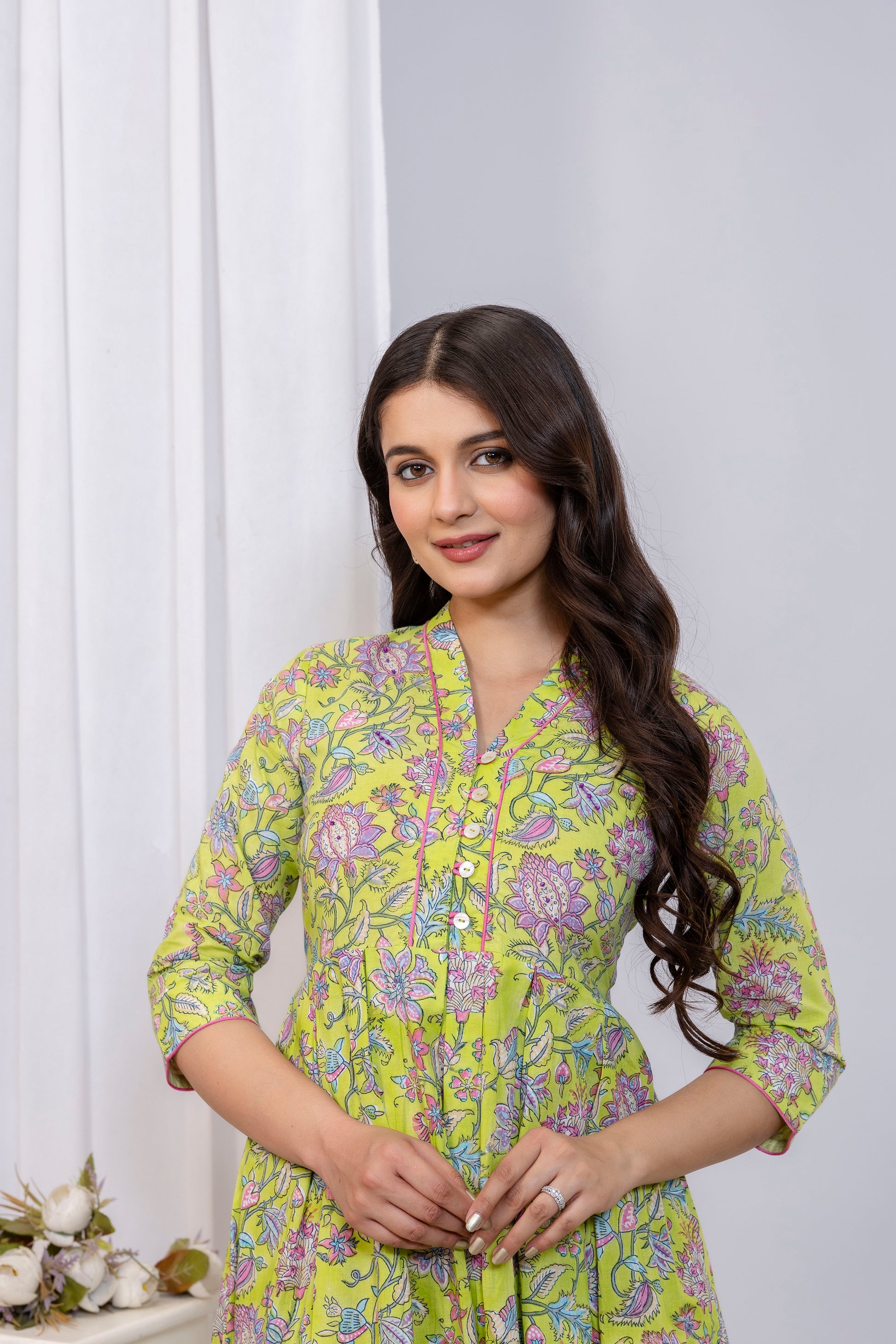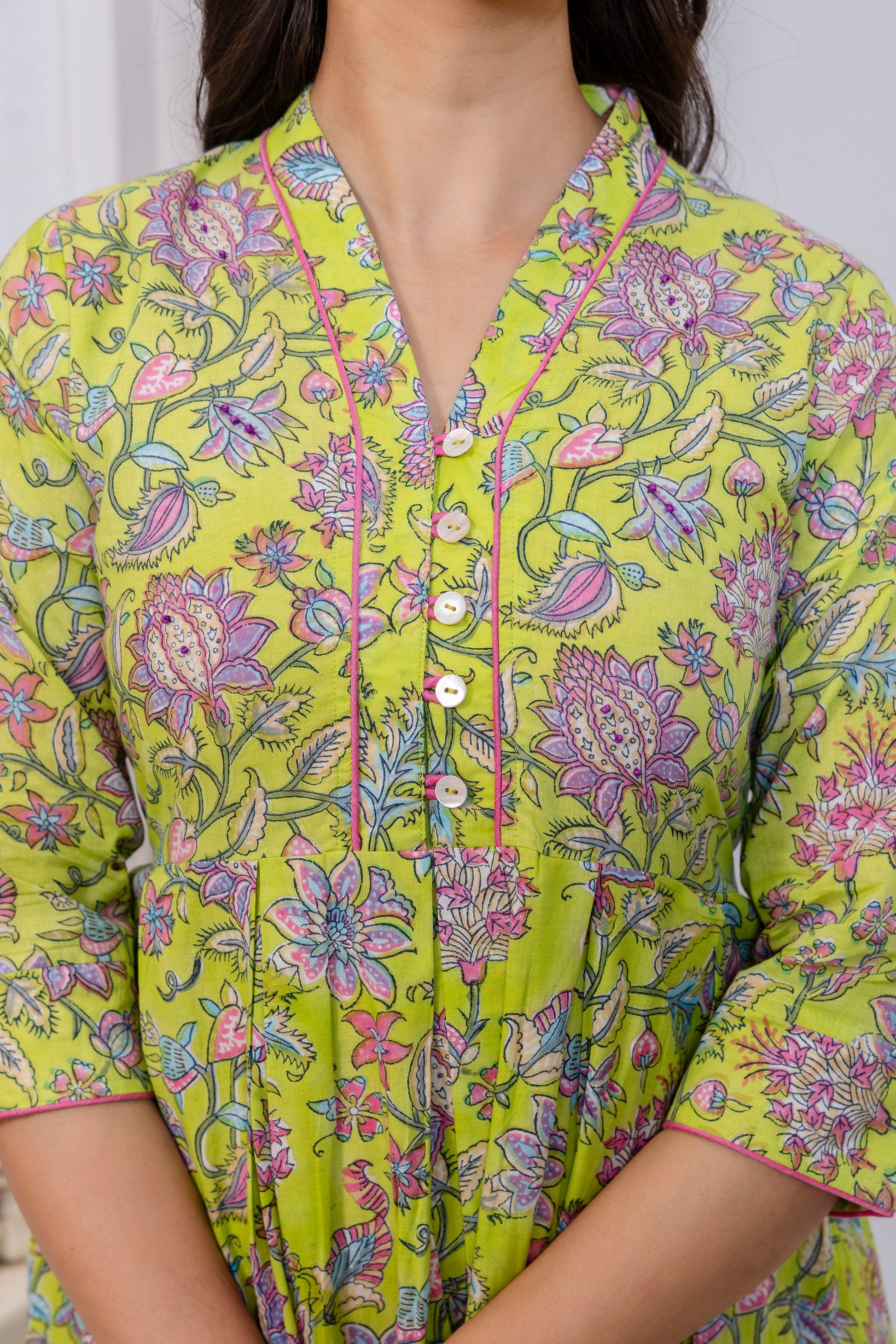 This green cotton dress exemplifies refined craftsmanship through its hand block printed floral motif and thoughtfully designed V-neck silhouette. Constructed from premium cotton fabric, it offers superior breathability and durability for everyday wear.