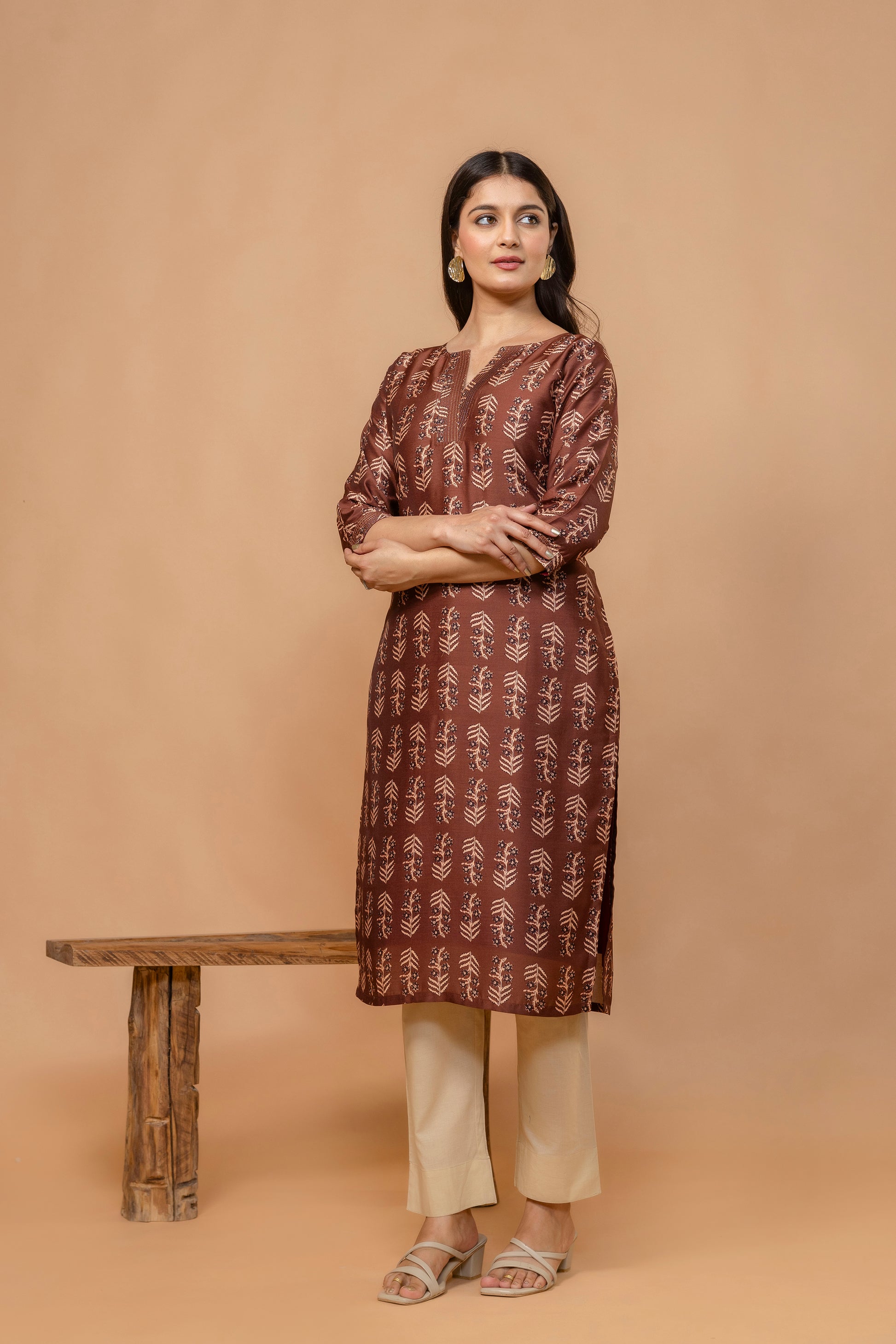 Elevate your ethnic wardrobe with this stunning brown kurta crafted from luxurious chanderi fabric. The delicate chanderi weave offers a soft, breathable drape that's perfect for both casual gatherings and festive occasions. Adorned with intricate block print detailing, each piece tells a story of traditional craftsmanship and artisanal excellence.