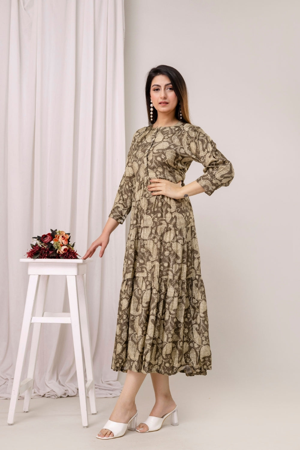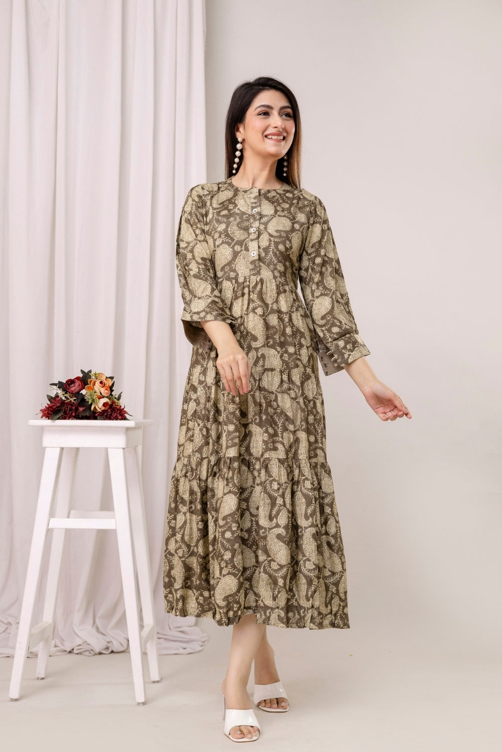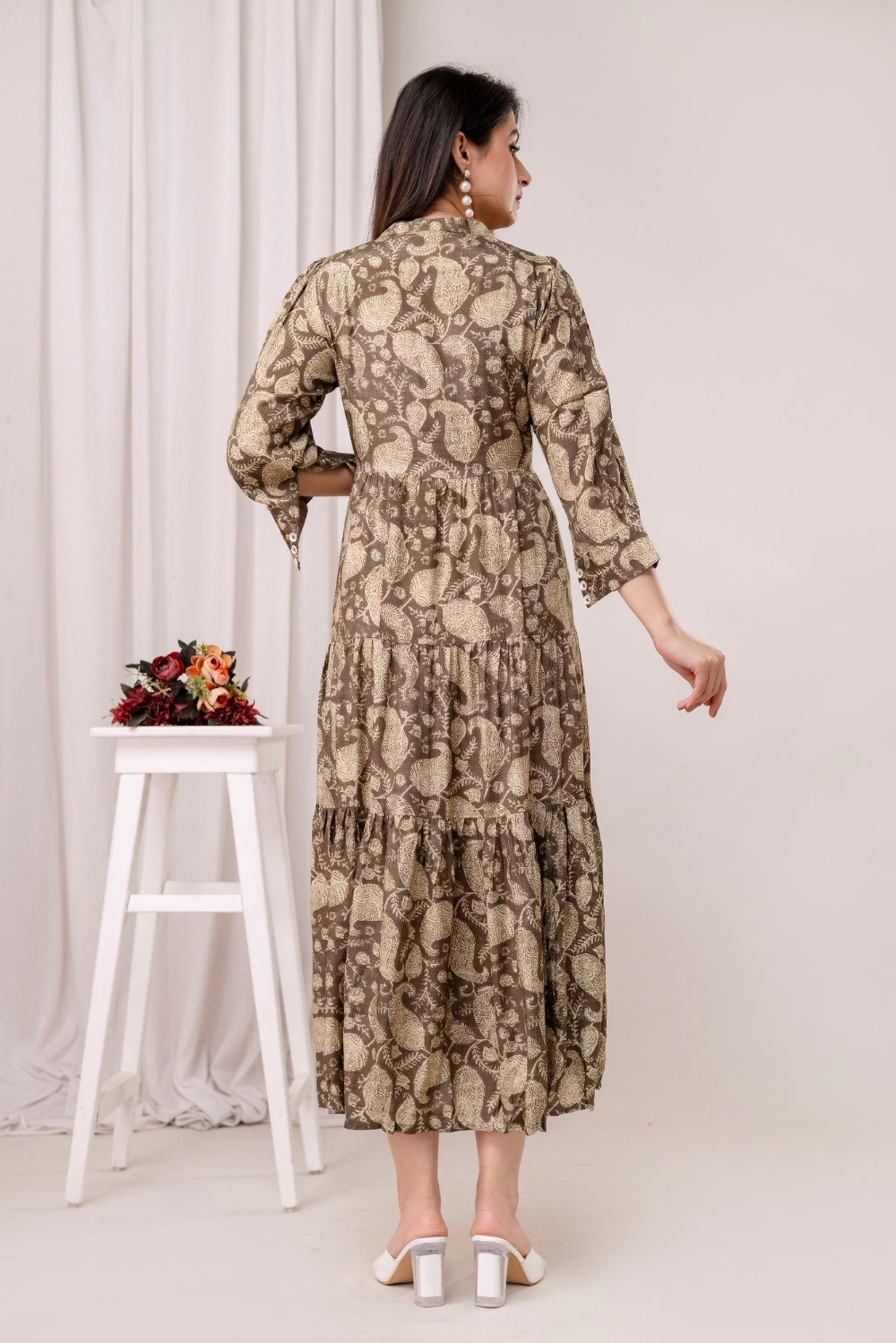 This beautifully layered crepe dress is adorned with an elegant paisley-inspired print in earthy tones.