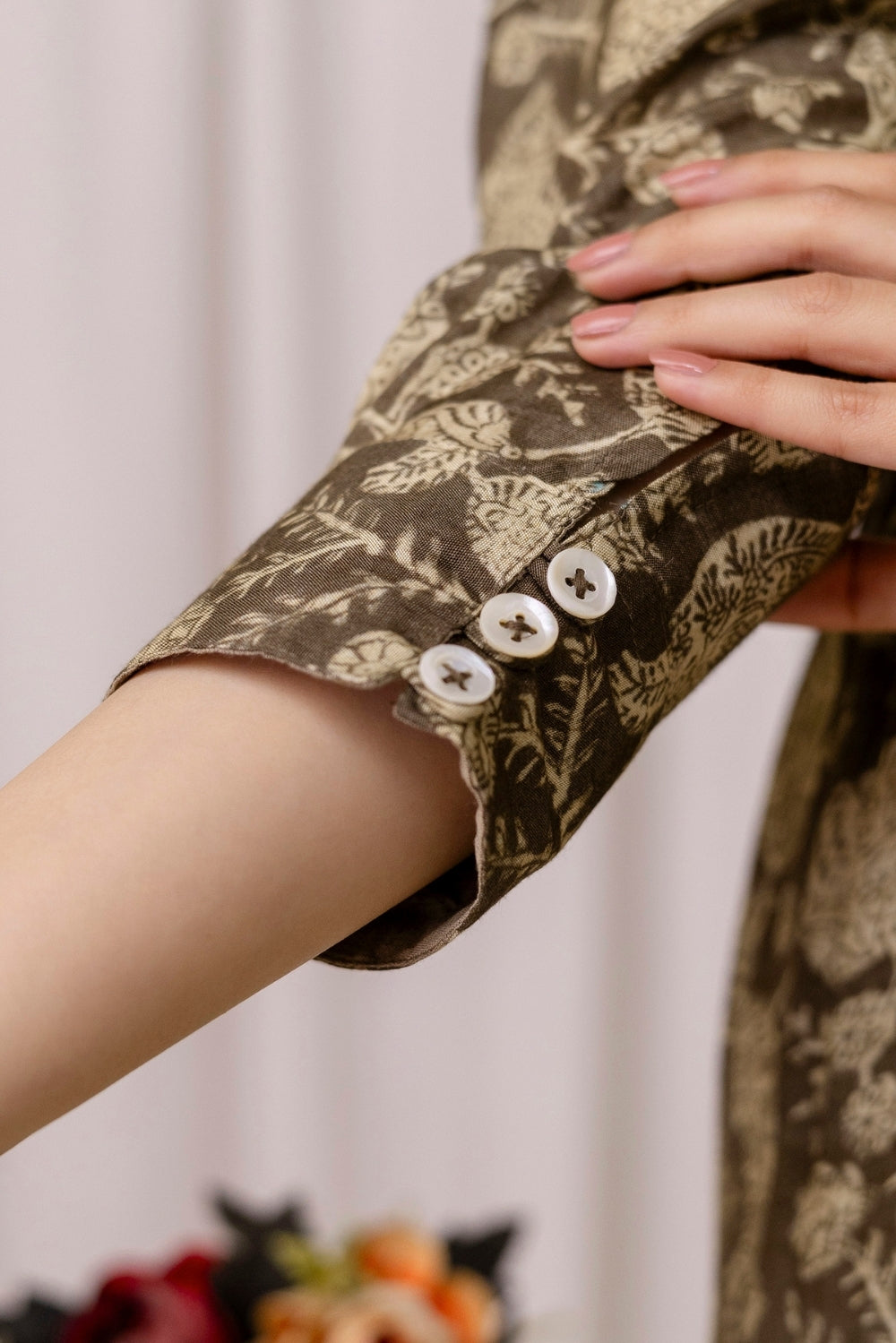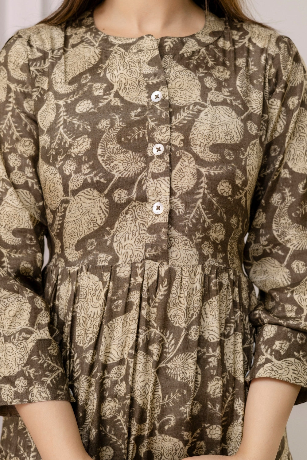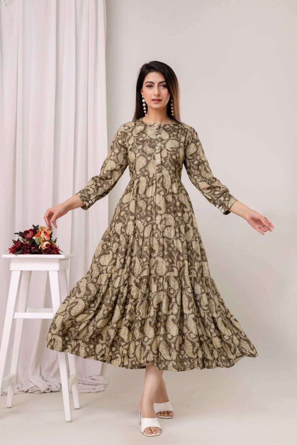 This beautifully layered crepe dress is adorned with an elegant paisley-inspired print in earthy tones.