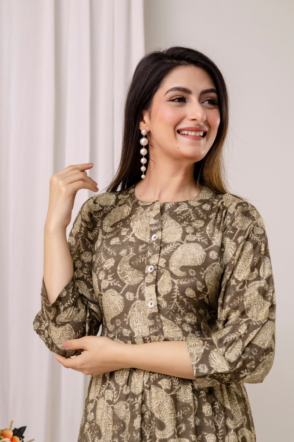 Designed with a flattering empire waistline, delicate front buttons, and a softly tiered silhouette that flows effortlessly with every step.