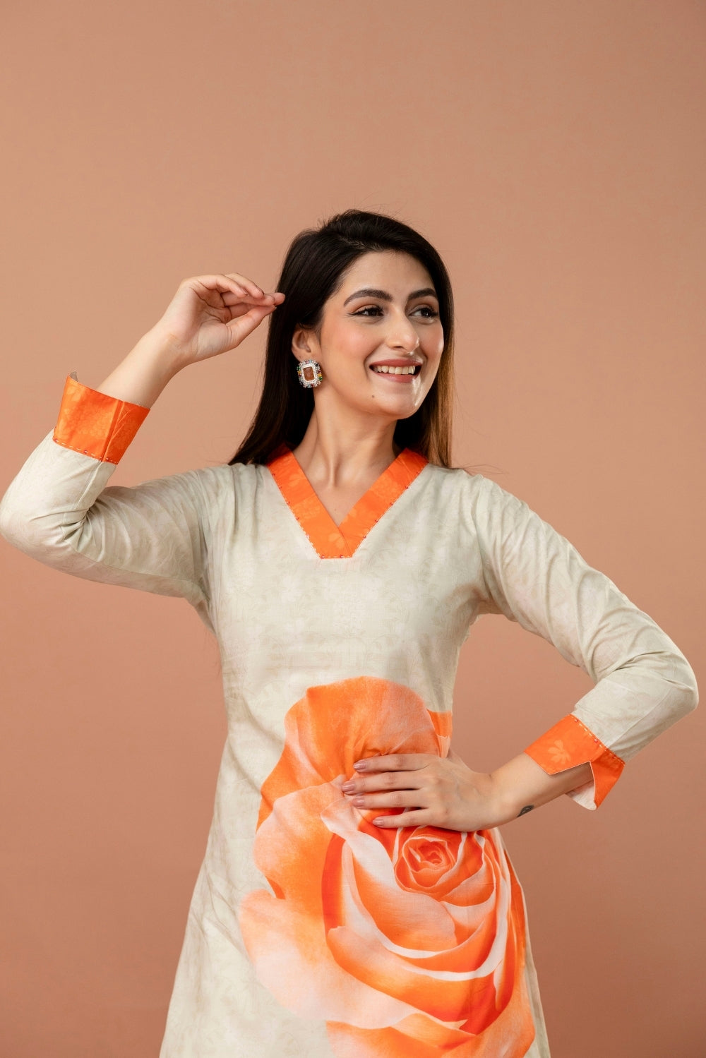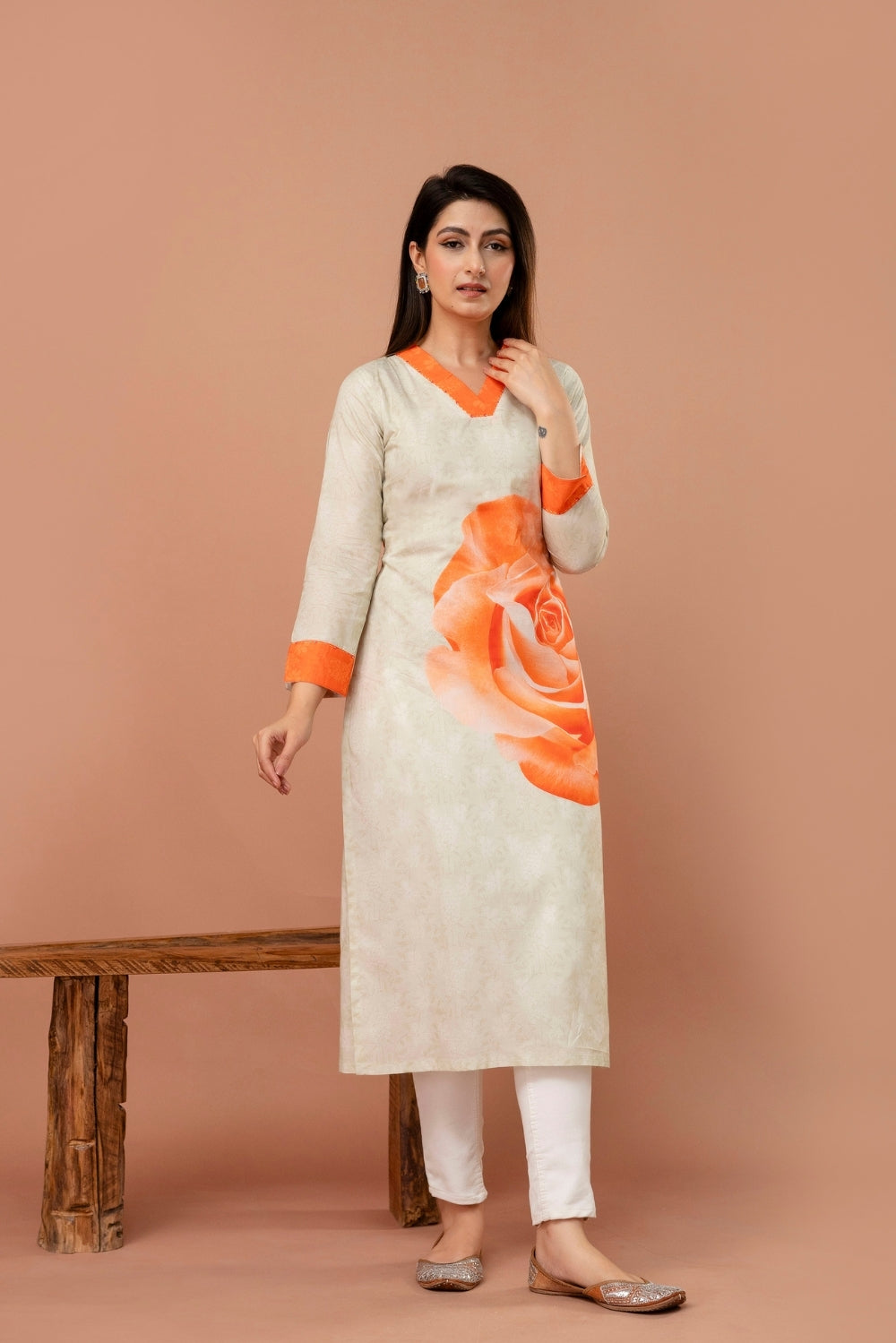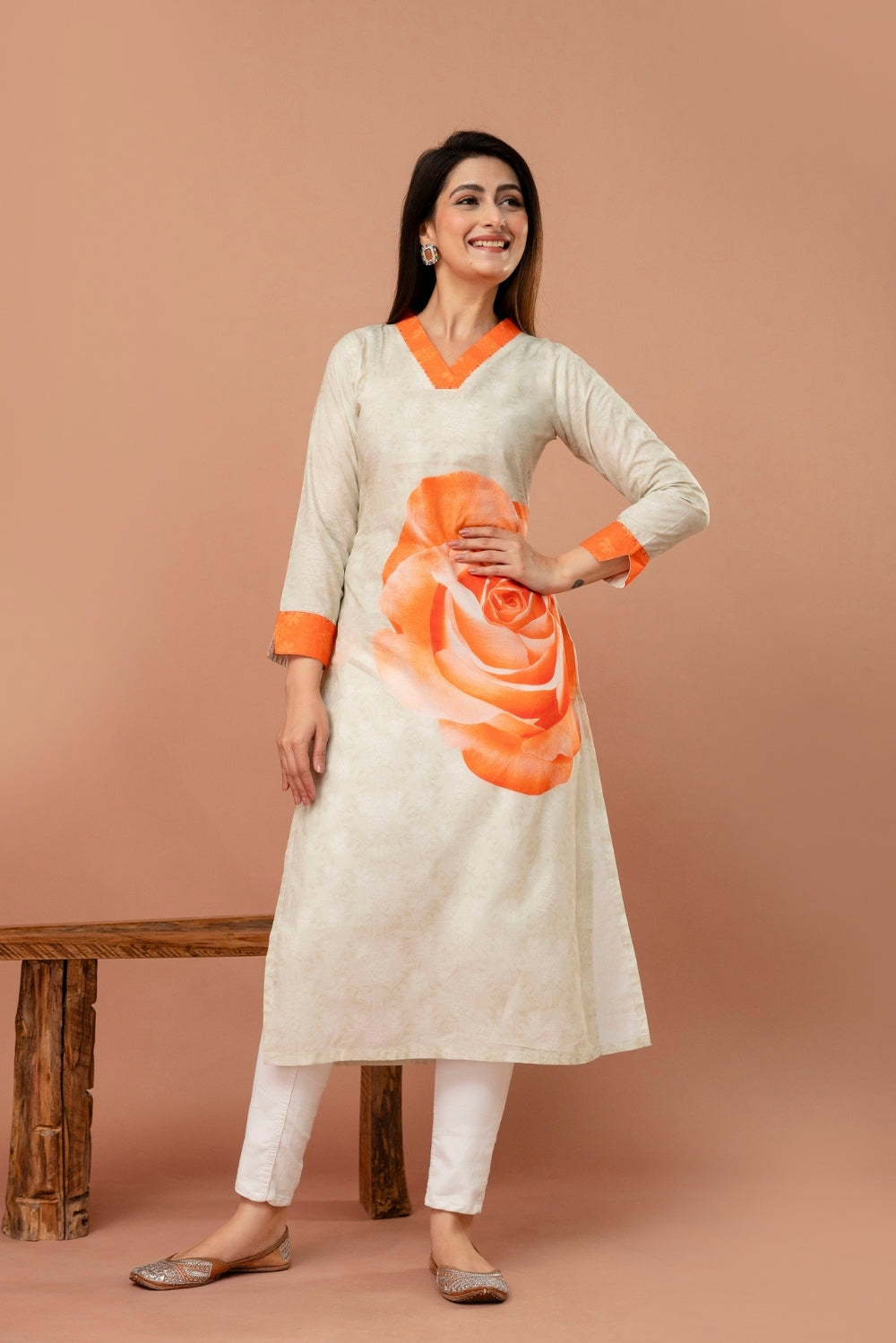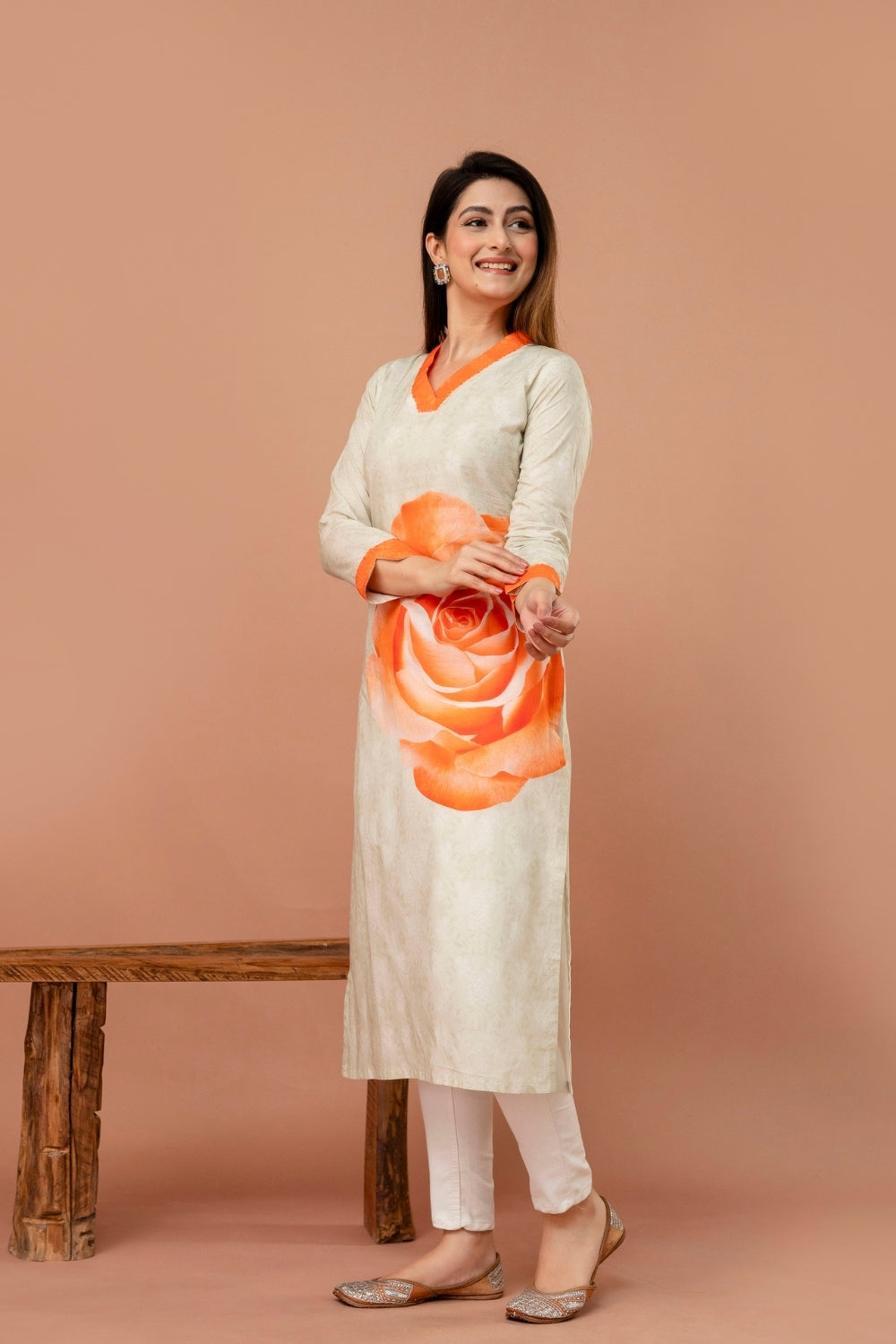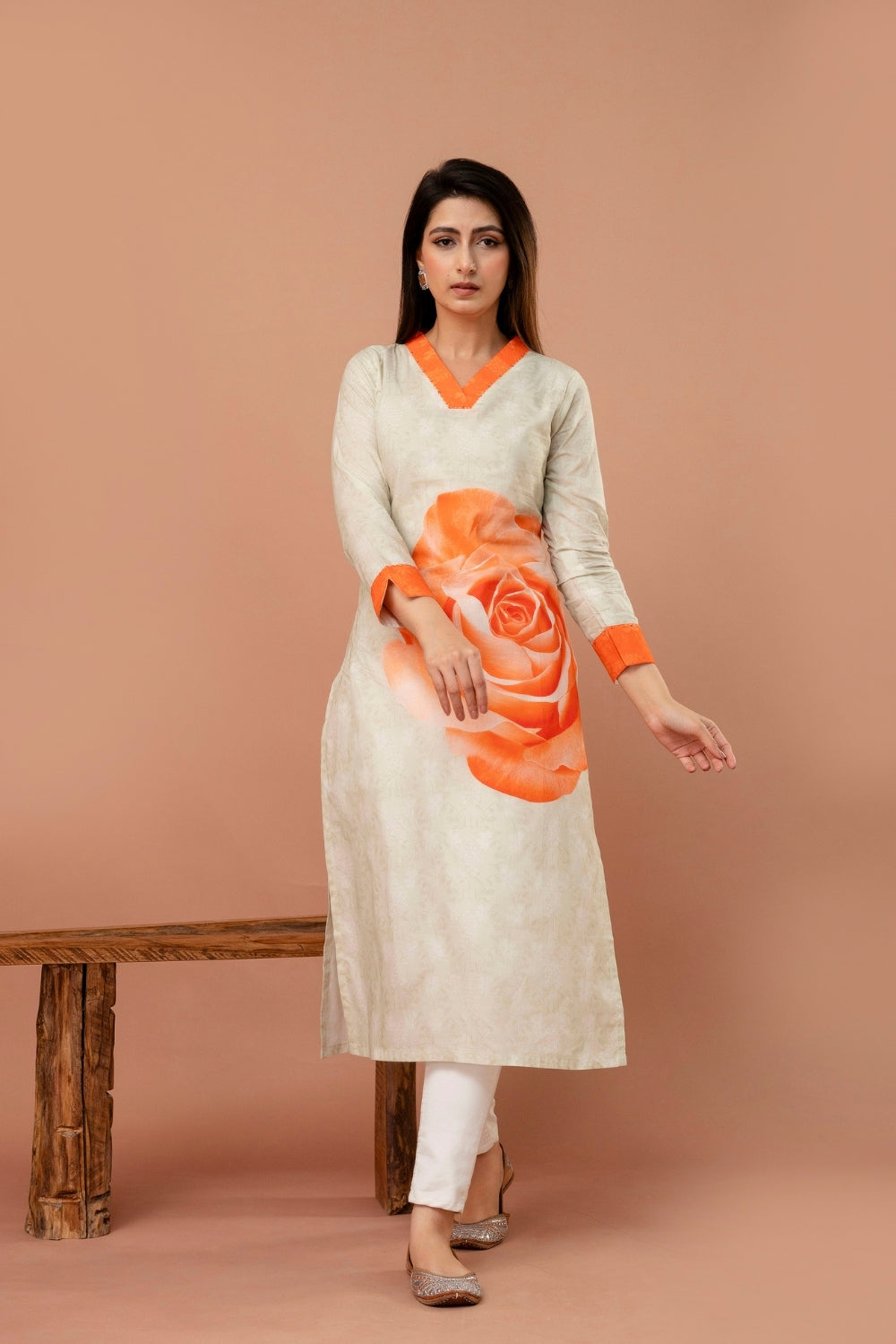 A timeless blend of elegance and vibrance, this ivory kurta is elevated by a striking orange rose motif that blooms beautifully across its front.