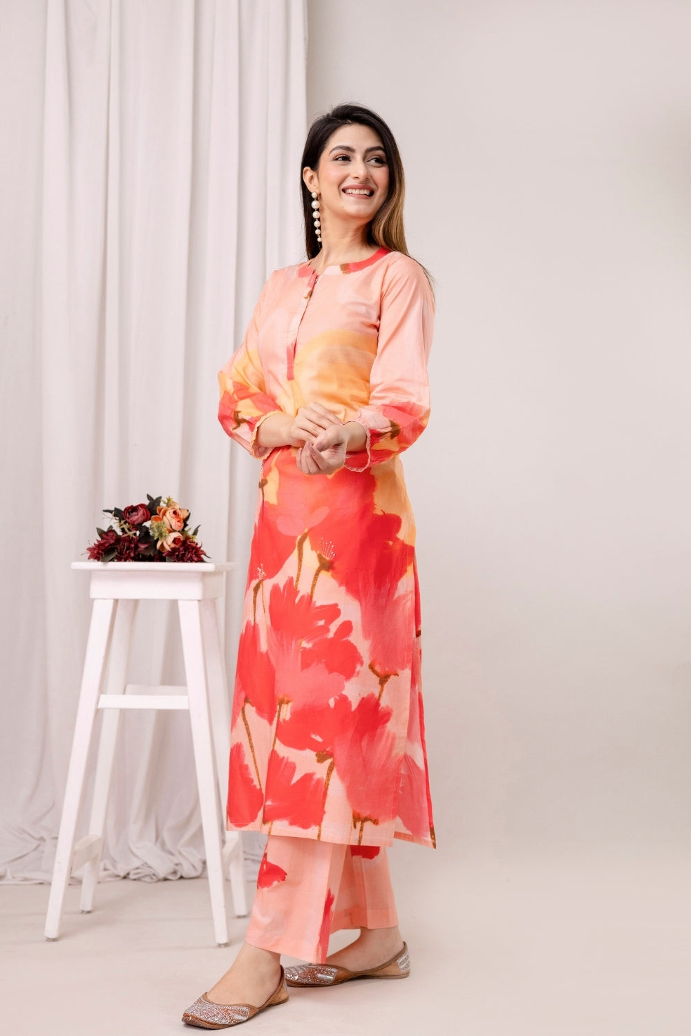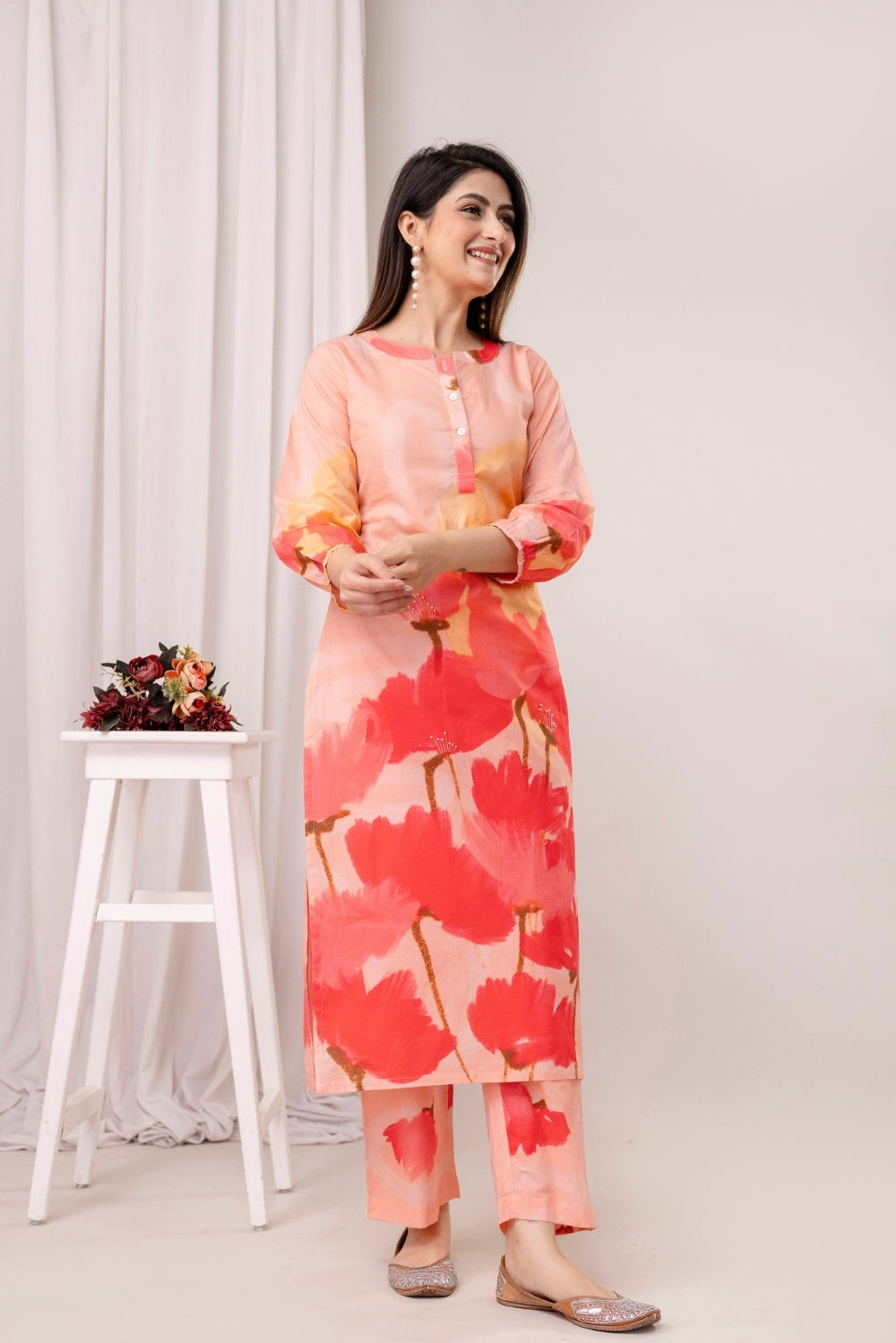 Make a cheerful statement with this vibrant cotton co-ord set, featuring blooming red poppies splashed across a delicate peach canvas.