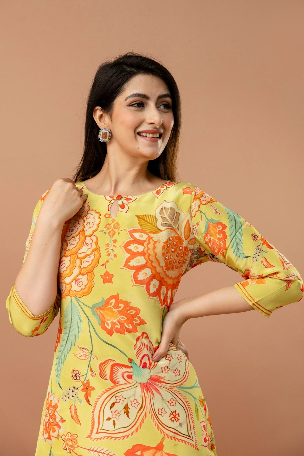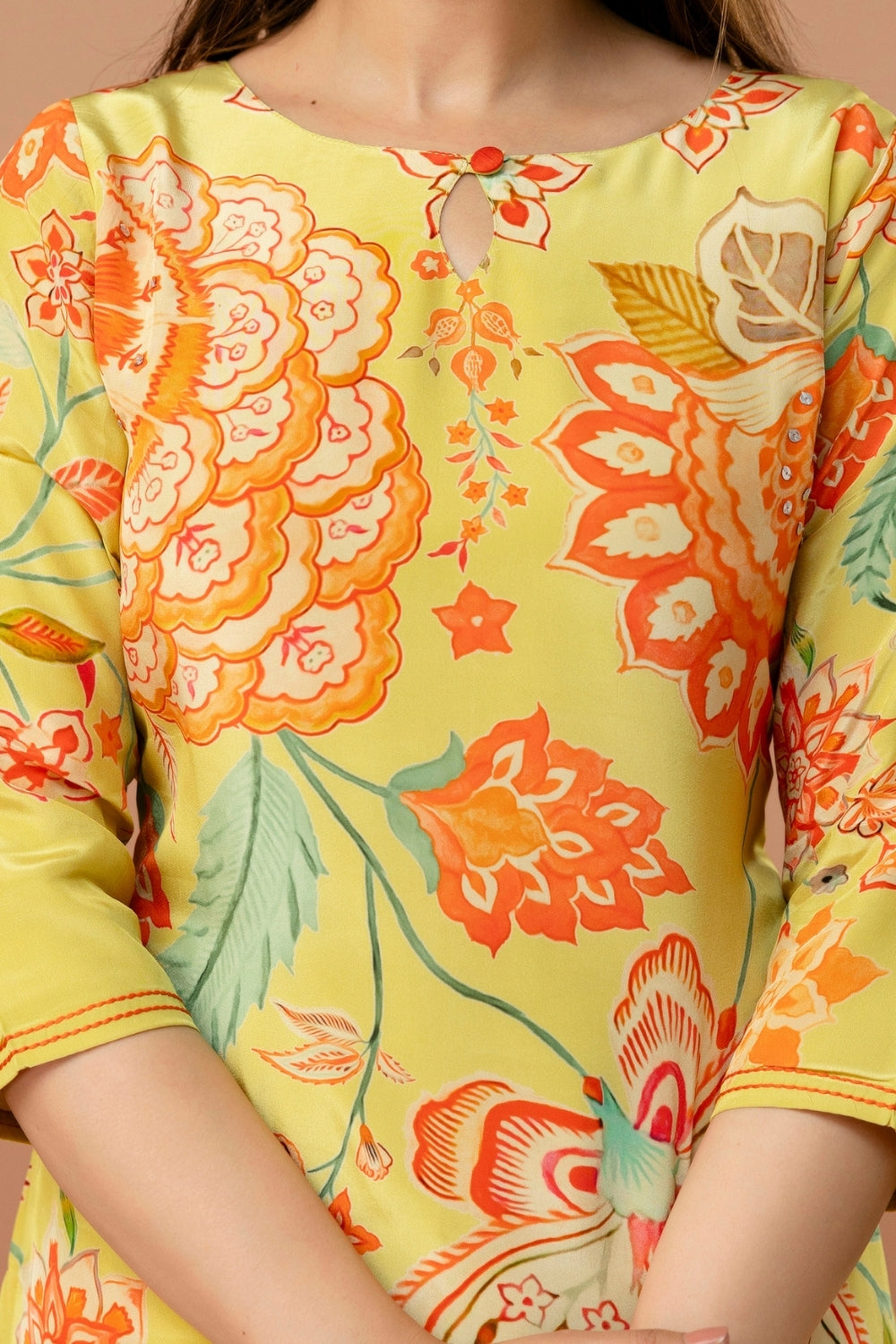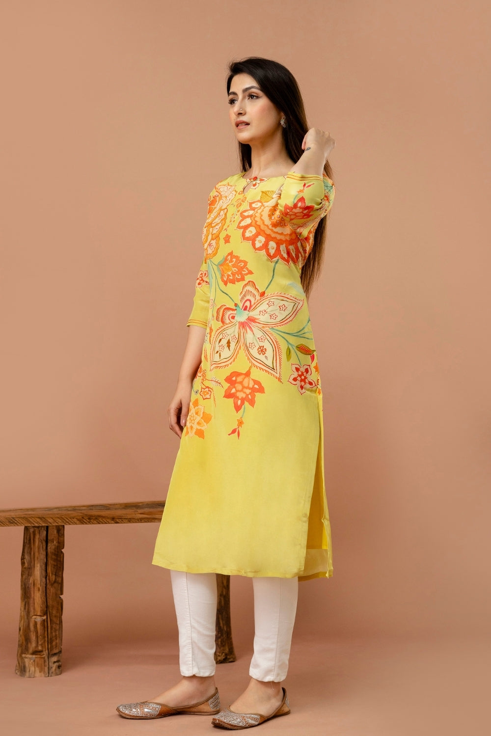 Bright, bold, and effortlessly chic — this stunning crepe kurta in a vibrant yellow hue is adorned with intricate floral prints in shades of coral, blush, and mint.