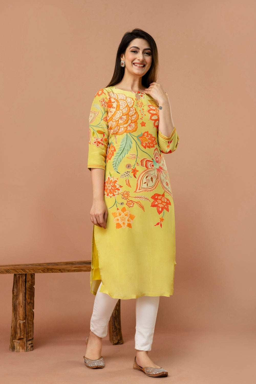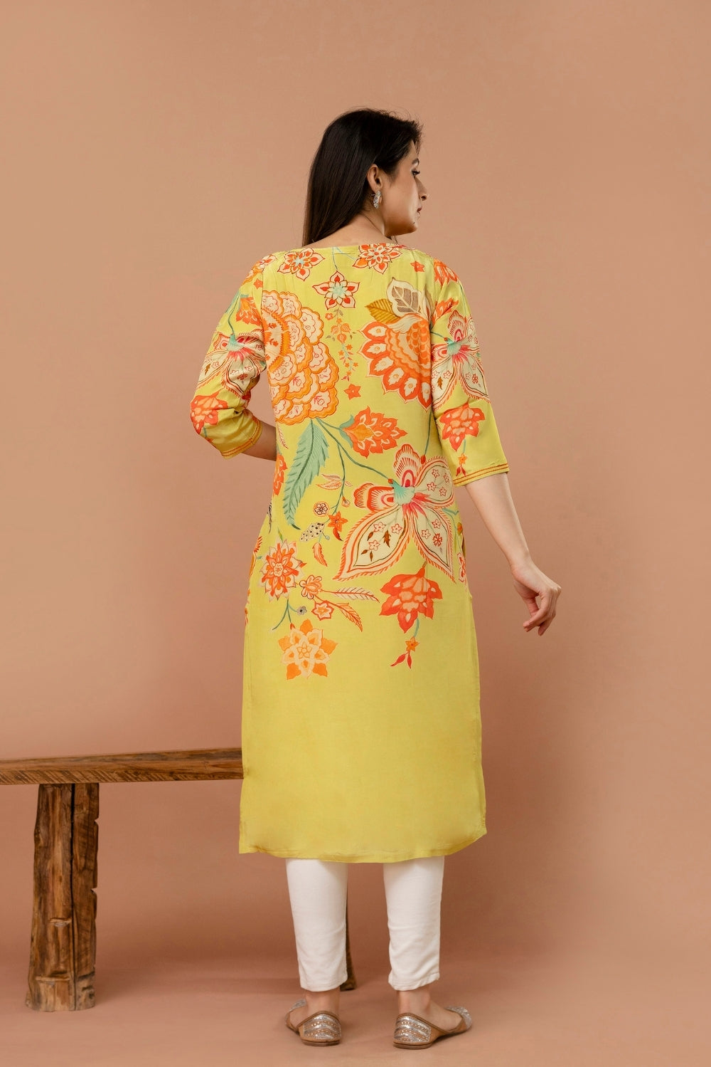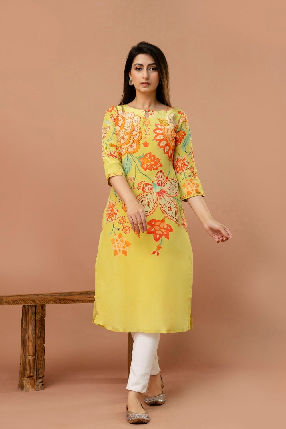 Bright, bold, and effortlessly chic — this stunning crepe kurta in a vibrant yellow hue is adorned with intricate floral prints in shades of coral, blush, and mint.