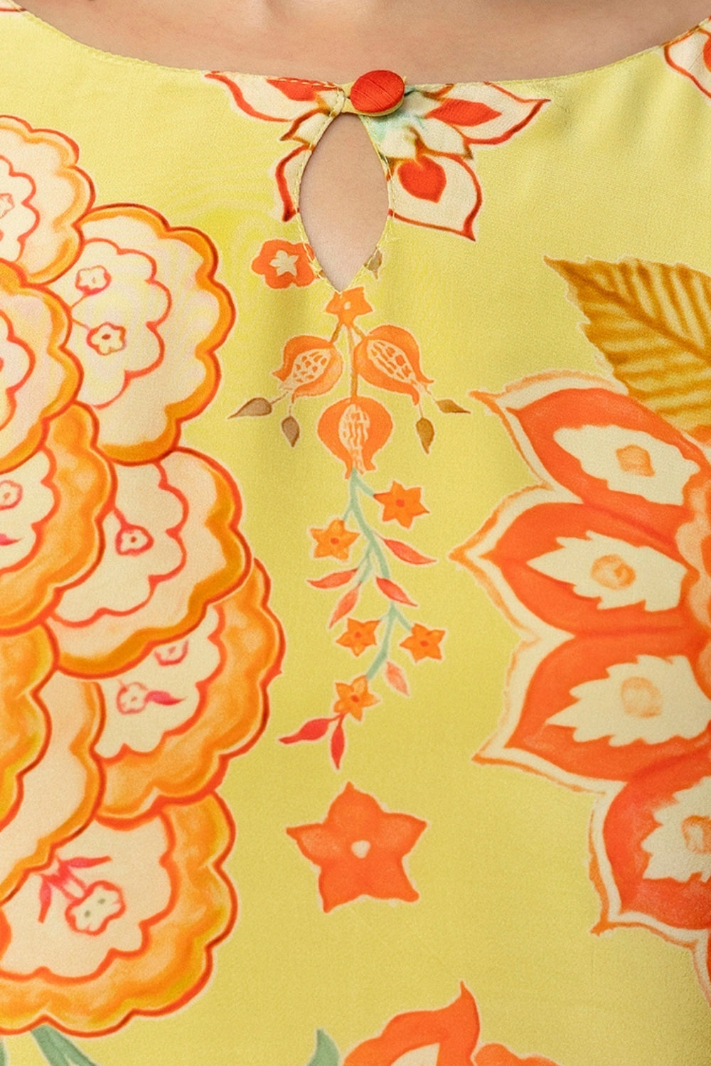 Lightweight crepe in vibrant yellow with floral prints in coral, blush, and mint tones.
