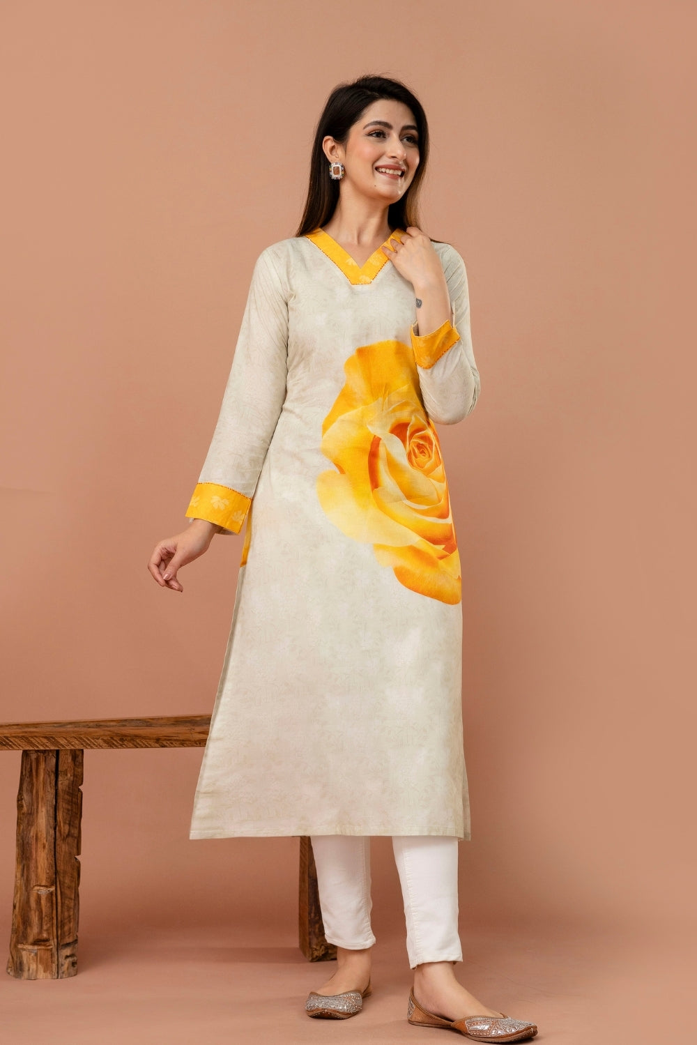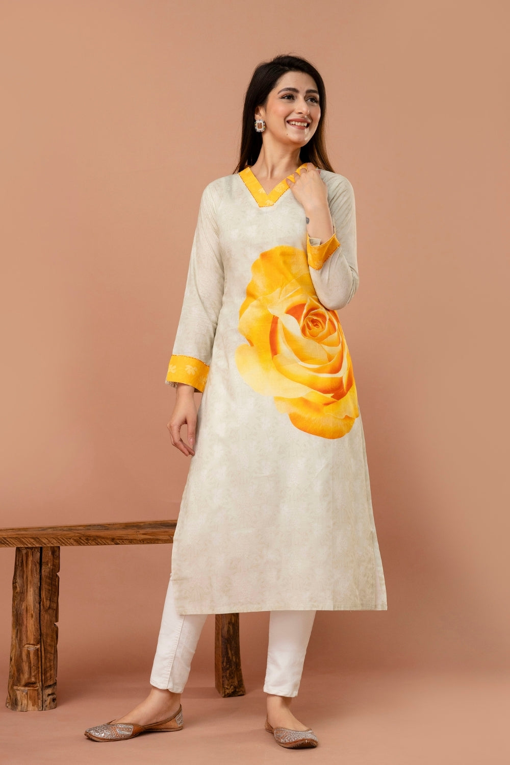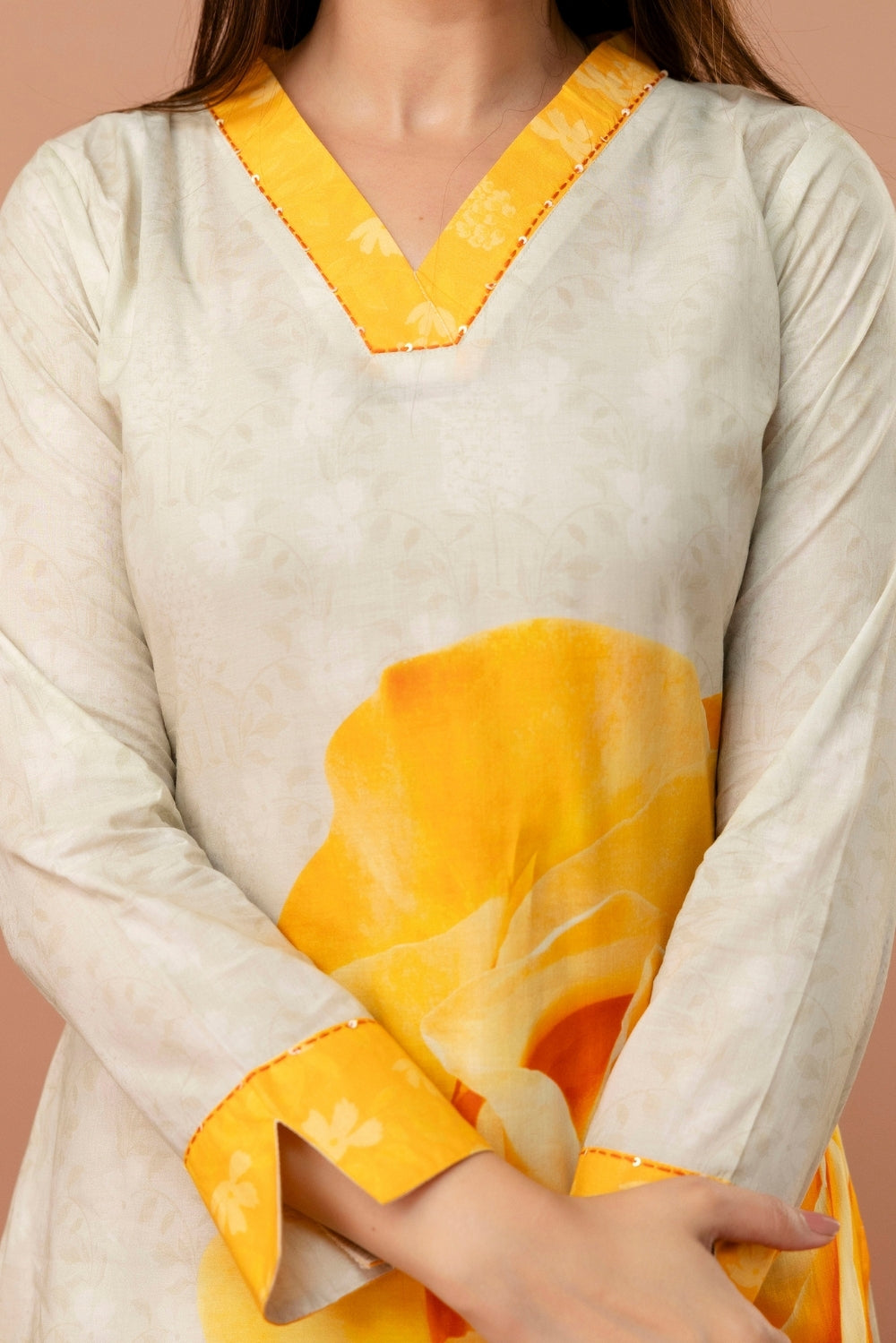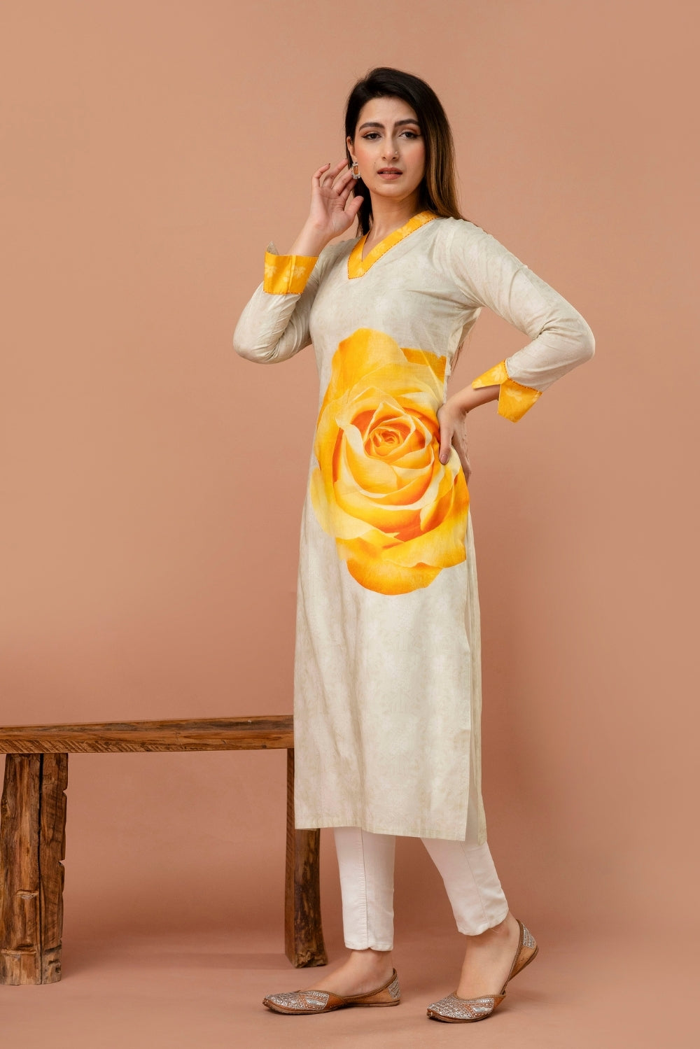 Graceful and understated, this ivory kurta comes alive with a stunning burst of sunshine — a vibrant yellow rose blooming beautifully across its canvas.